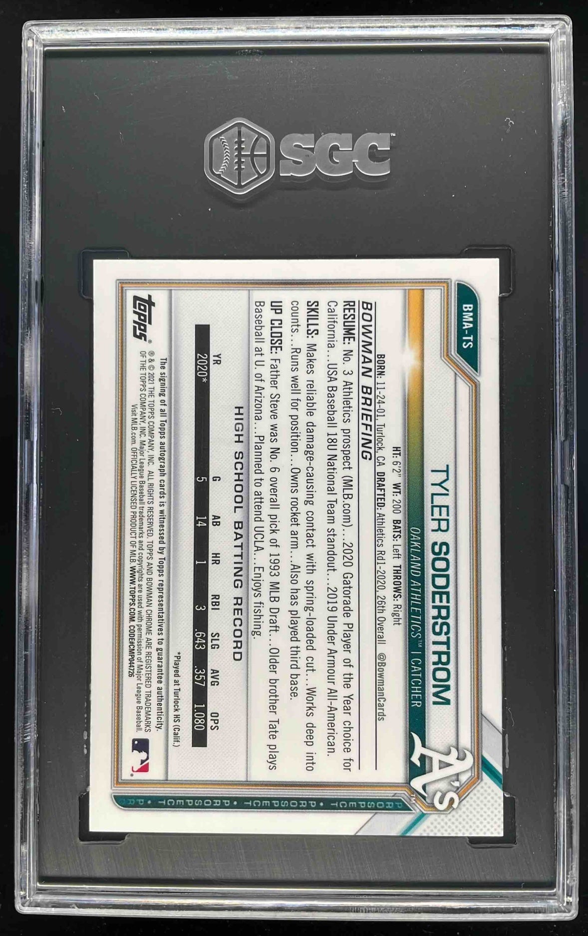 2021 Bowman Chrome Prospect Mega Box Mojo #BMA-TS Tyler Soderstrom Auto SGC 10