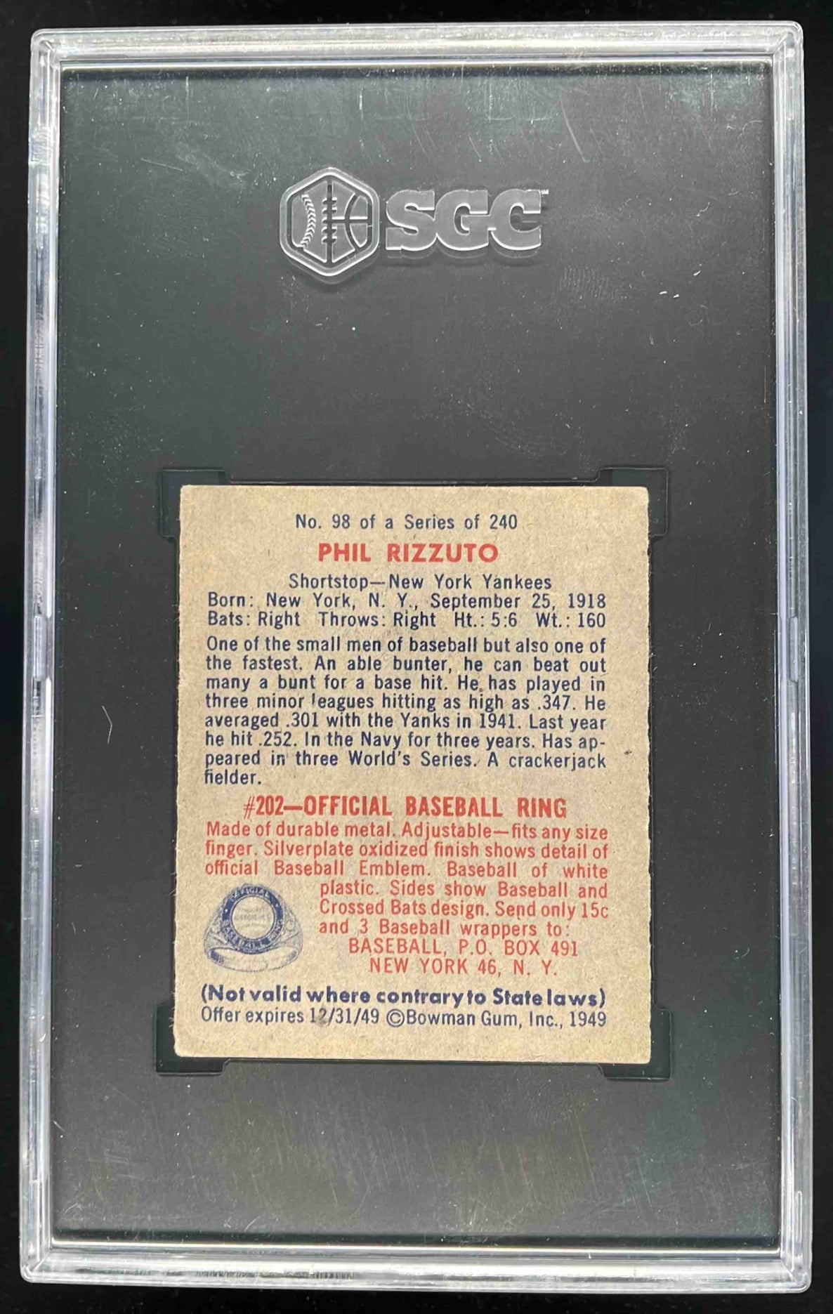 1949 Bowman #98 Phil Rizzuto No Name On Front SGC 4