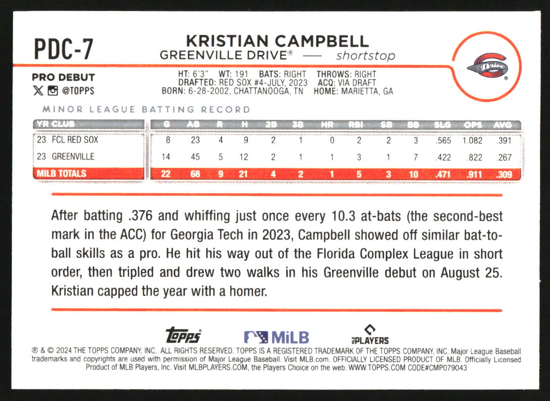 2024 Topps Pro Debut Chrome Aqua Refractor #PDC-7 Kristian Campbell /75