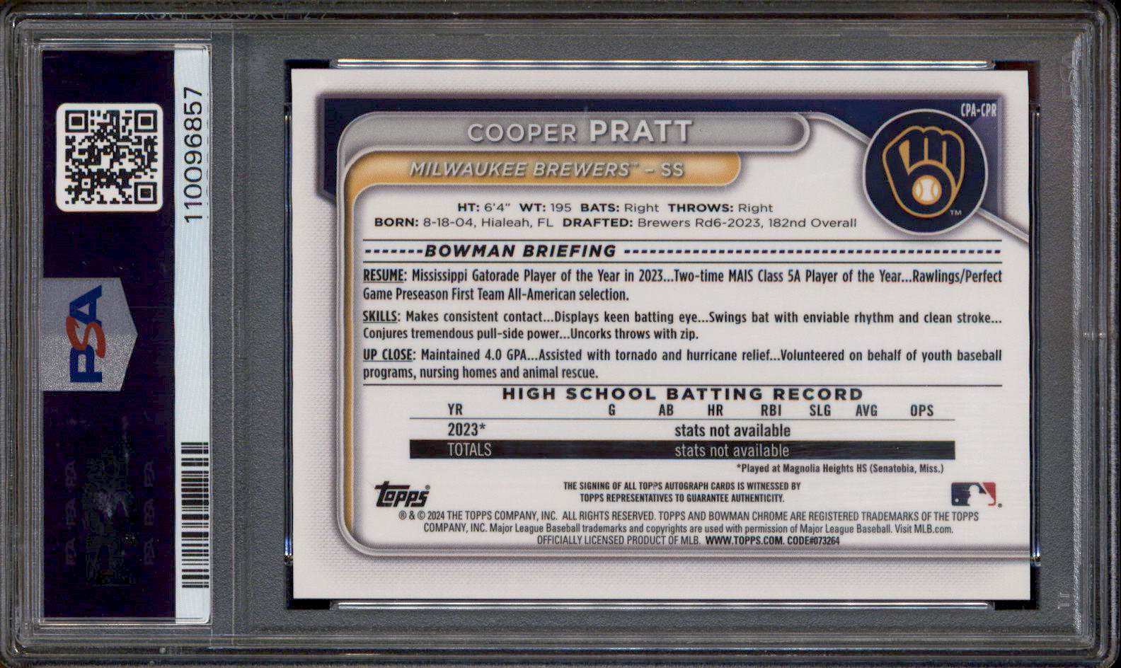 2024 Bowman Chrome Auto Blue Lunar Refractor #CPACPR Cooper Pratt RC /150 PSA 10