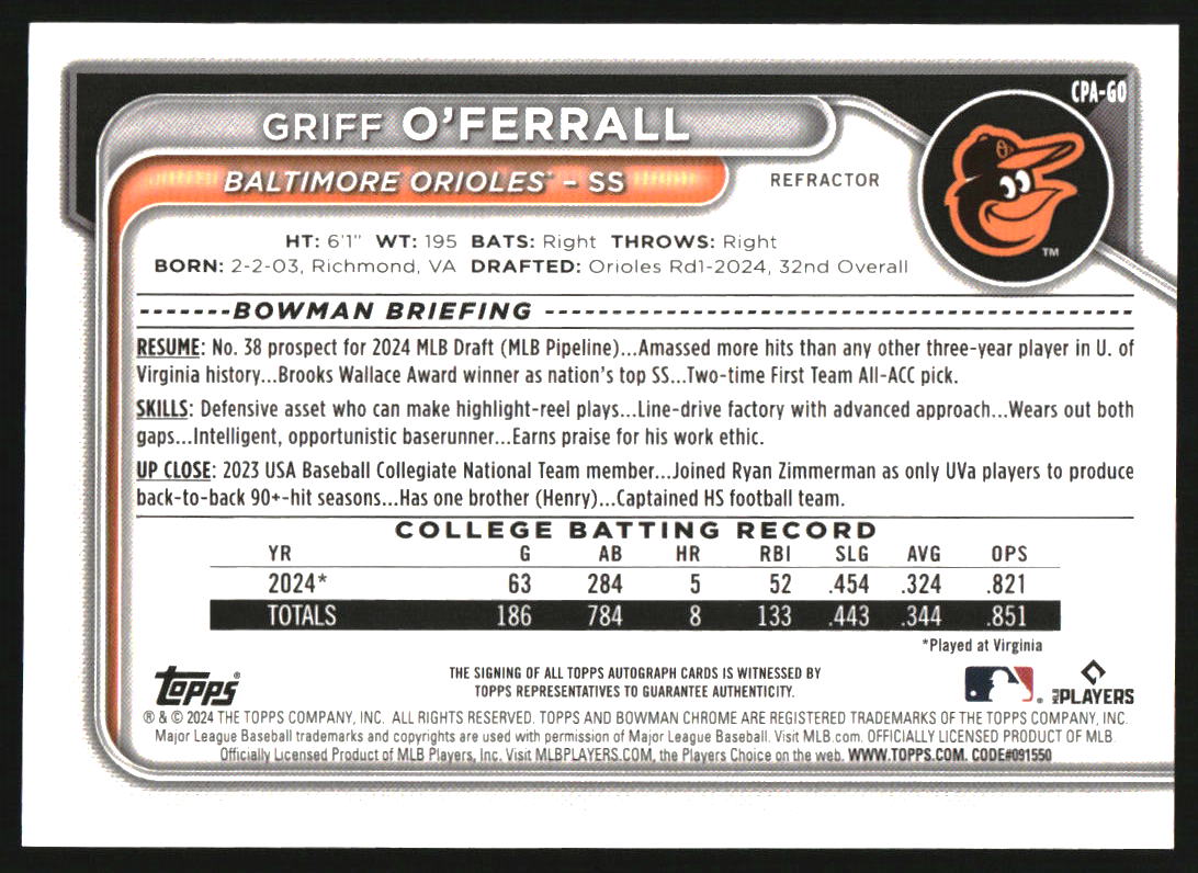2024 Bowman Chrome Autographs Refractor #CPA-GO Griff O'Ferrall RC Auto /499
