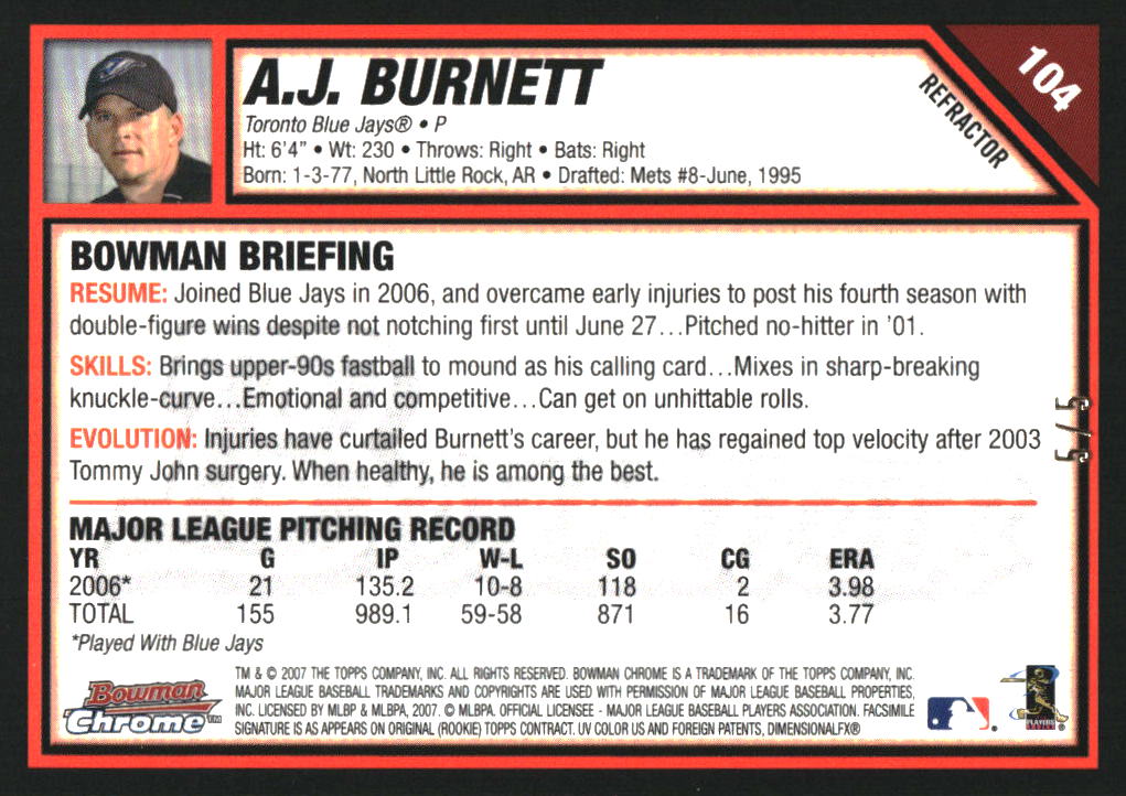 2007 Bowman Chrome Red Refractors #104 A.J. Burnett /5