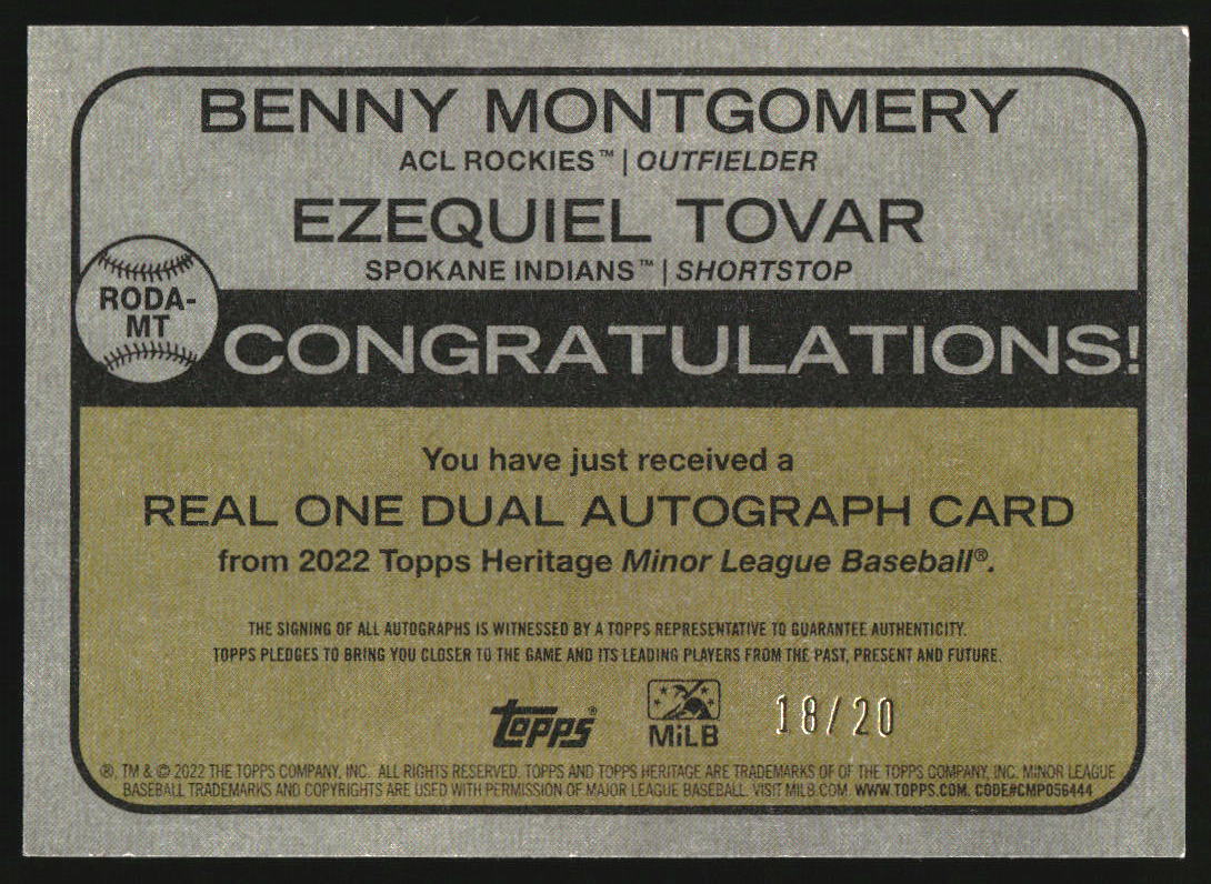 2022 Topps Heritage Minors Dual Auto Ezequiel Tovar Benny Montgomery /20