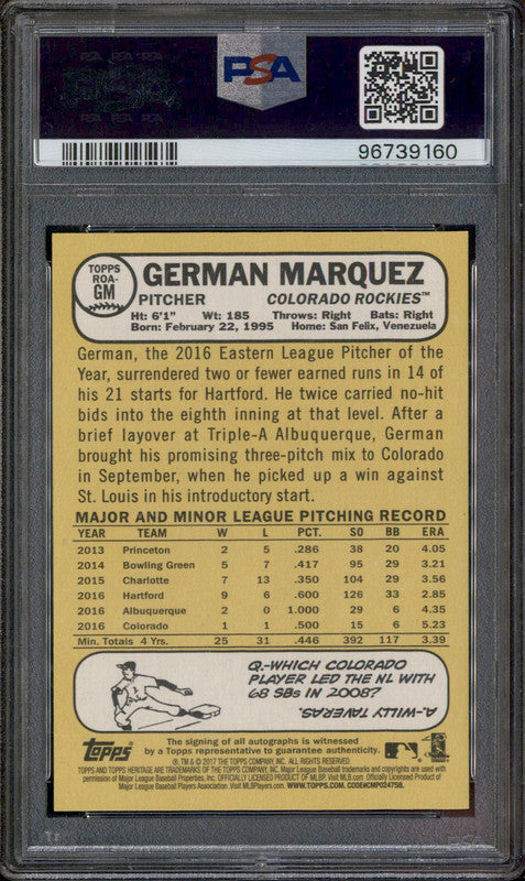 2017 Topps Heritage Real One Autograph Red Ink German Marquez RC Auto /68 PSA 10