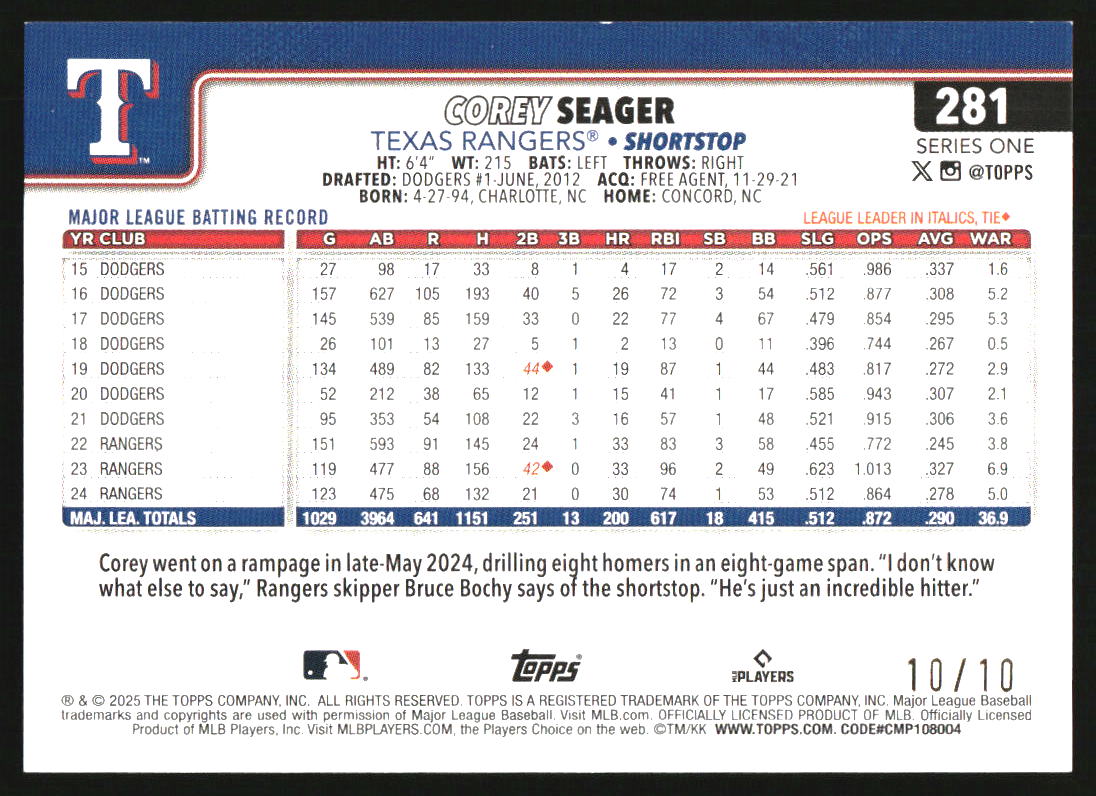 2025 Topps Tokyo Series Murakami Variation #281 Corey Seager /10