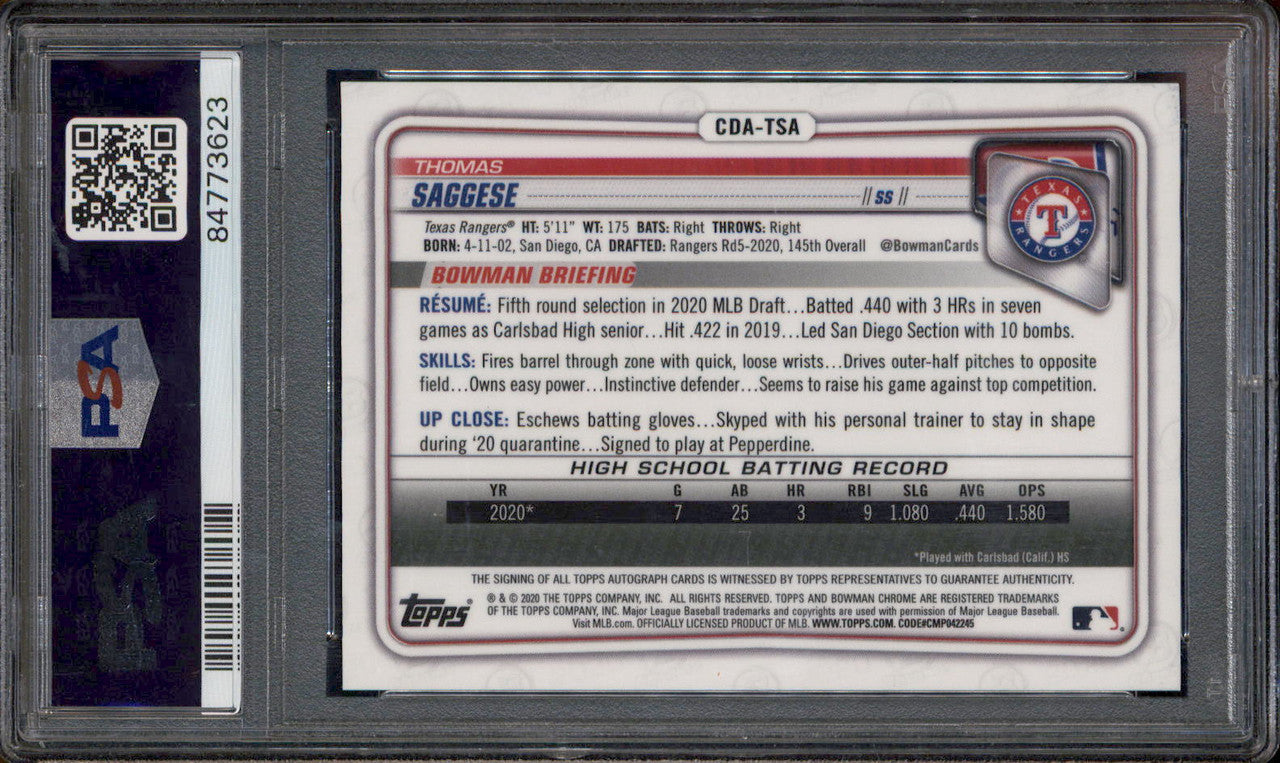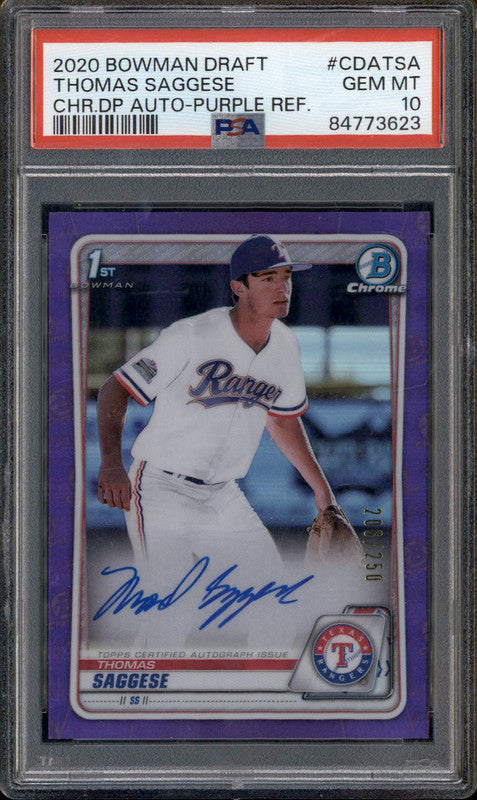 2020 Bowman Chrome Draft Auto Purple Refractor Thomas Saggese RC /250 PSA 10