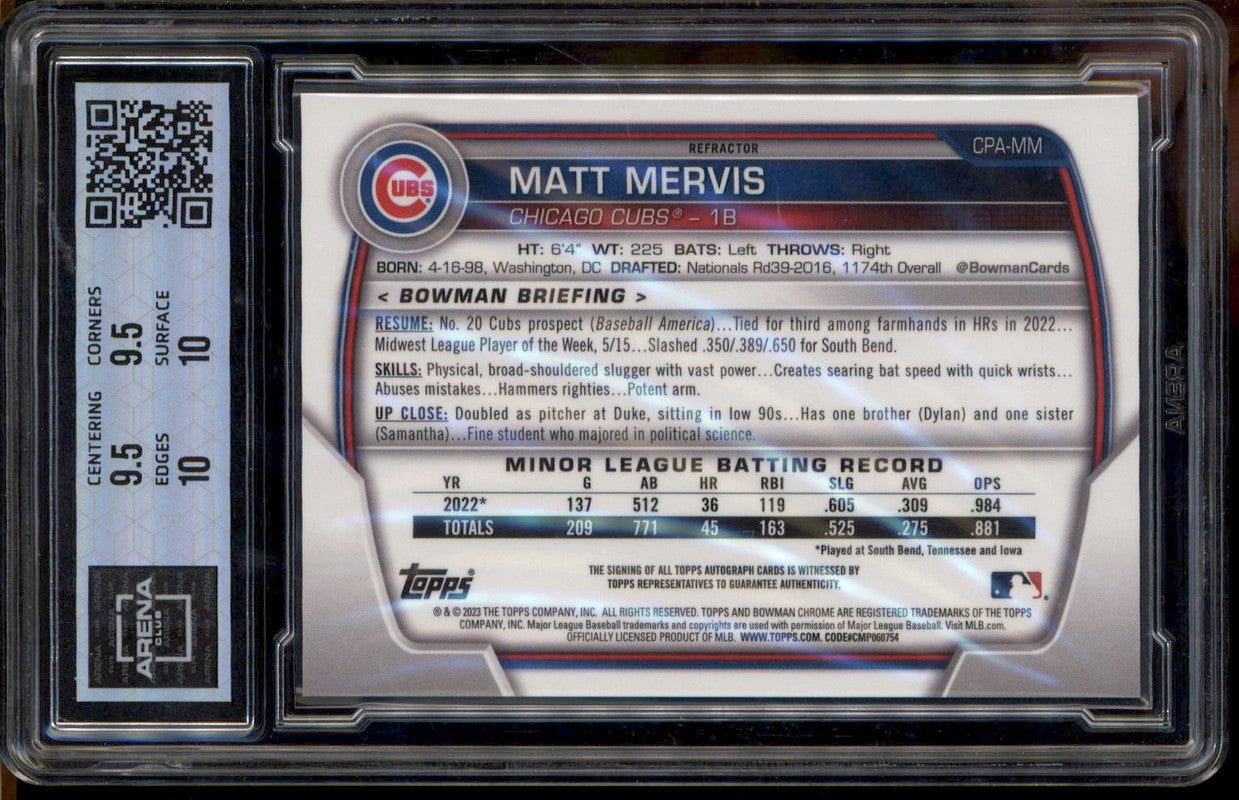 2023 Bowman Chrome Rookie Autograph Refractor Matt Mervis RC Auto /499 Arena 10