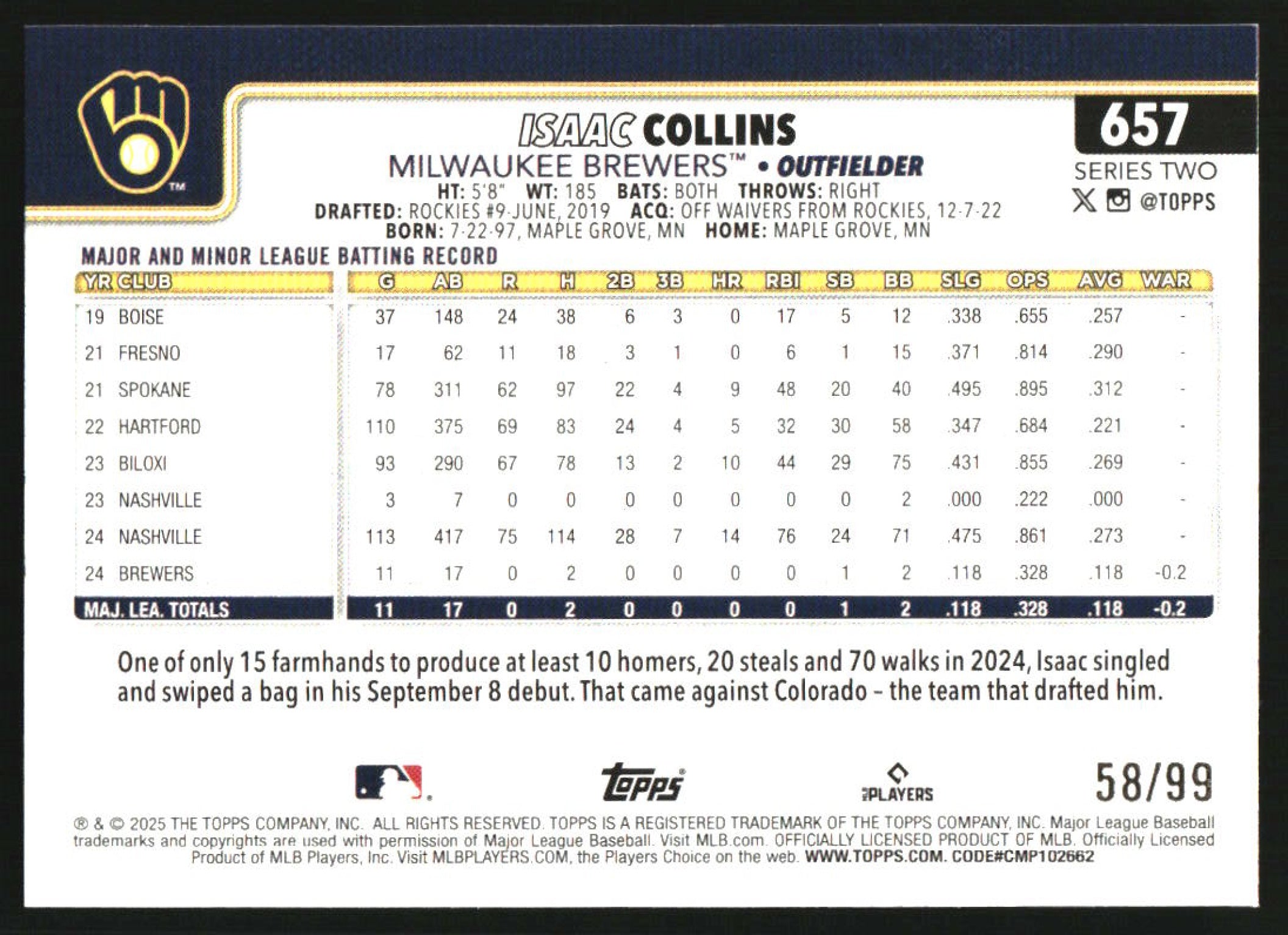 2025 Topps Holiday Hot Dogs #657 Isaac Collins RC /99
