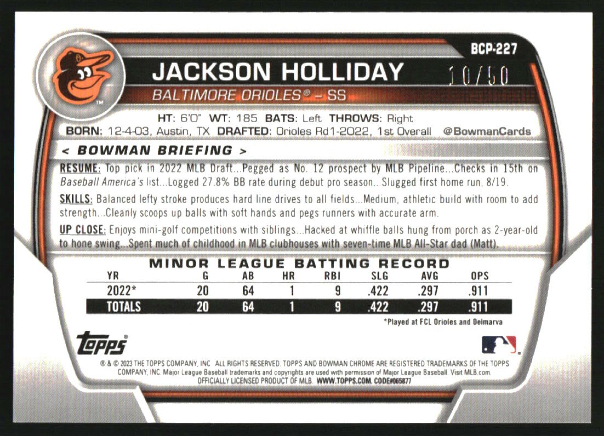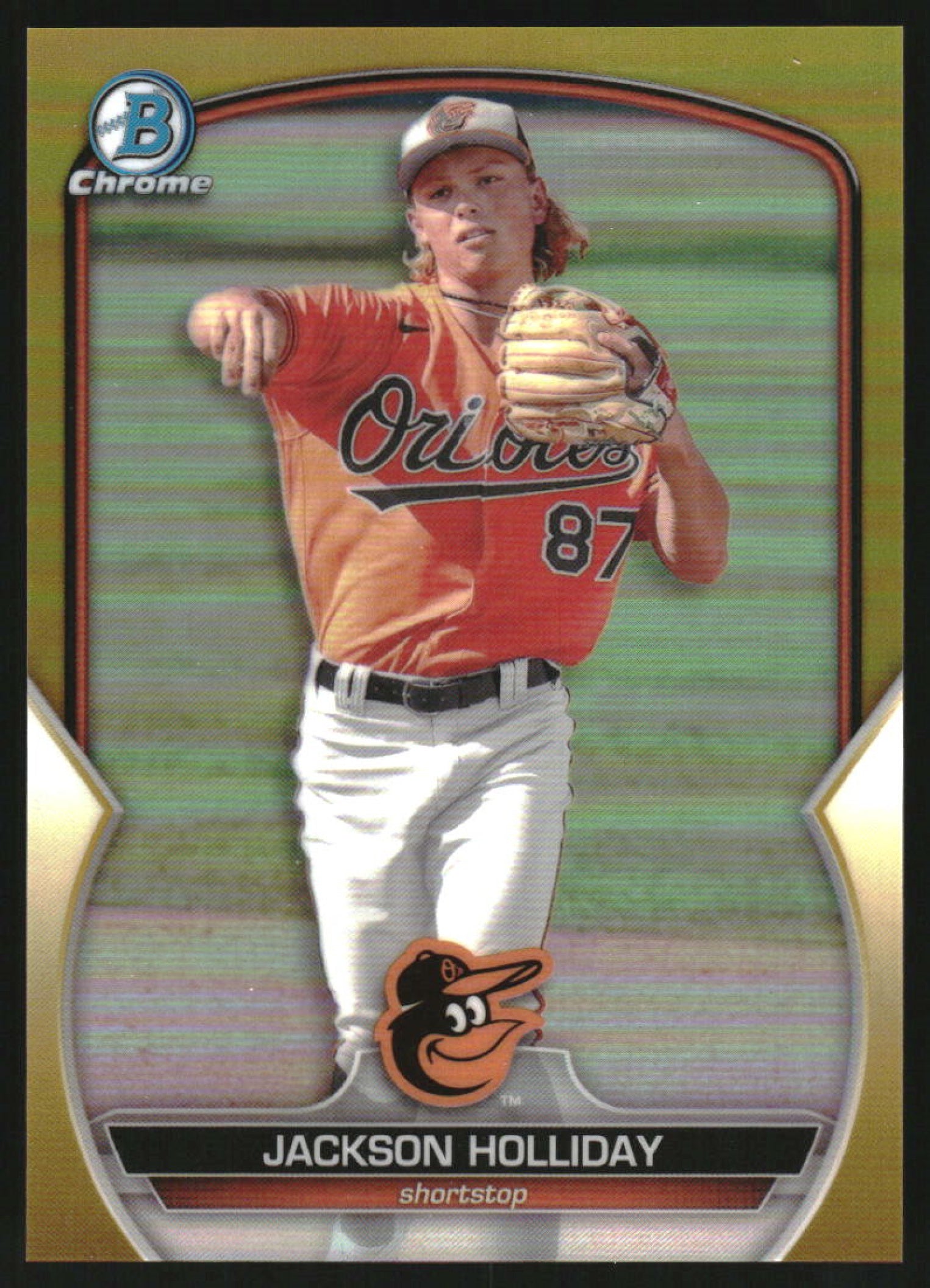 2023 Bowman Chrome Chrome Prospects Gold Refractor #BCP-227 Jackson Holliday /50