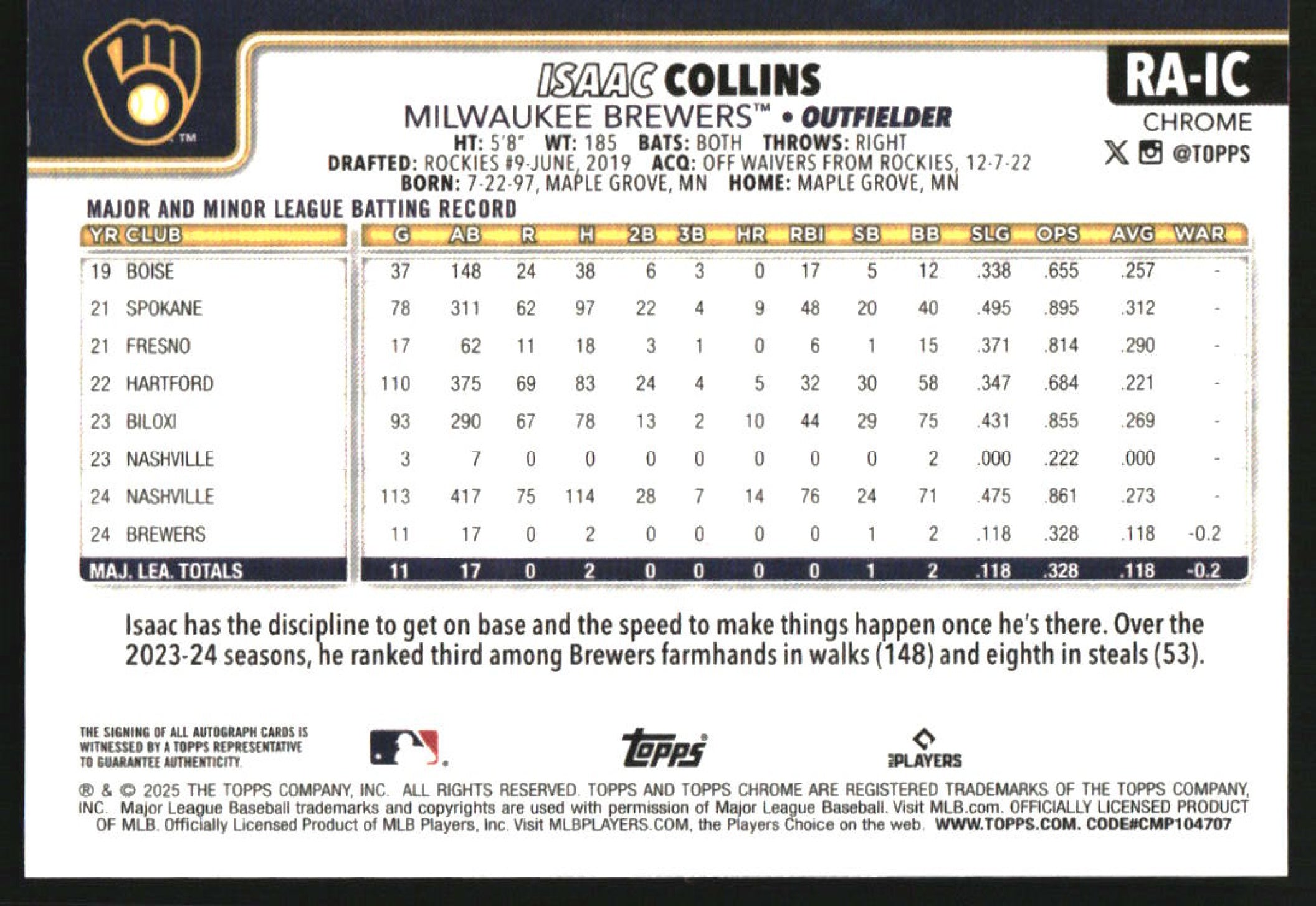 2025 Topps Chrome Rookie Autographs #RA-IC Isaac Collins RC Auto