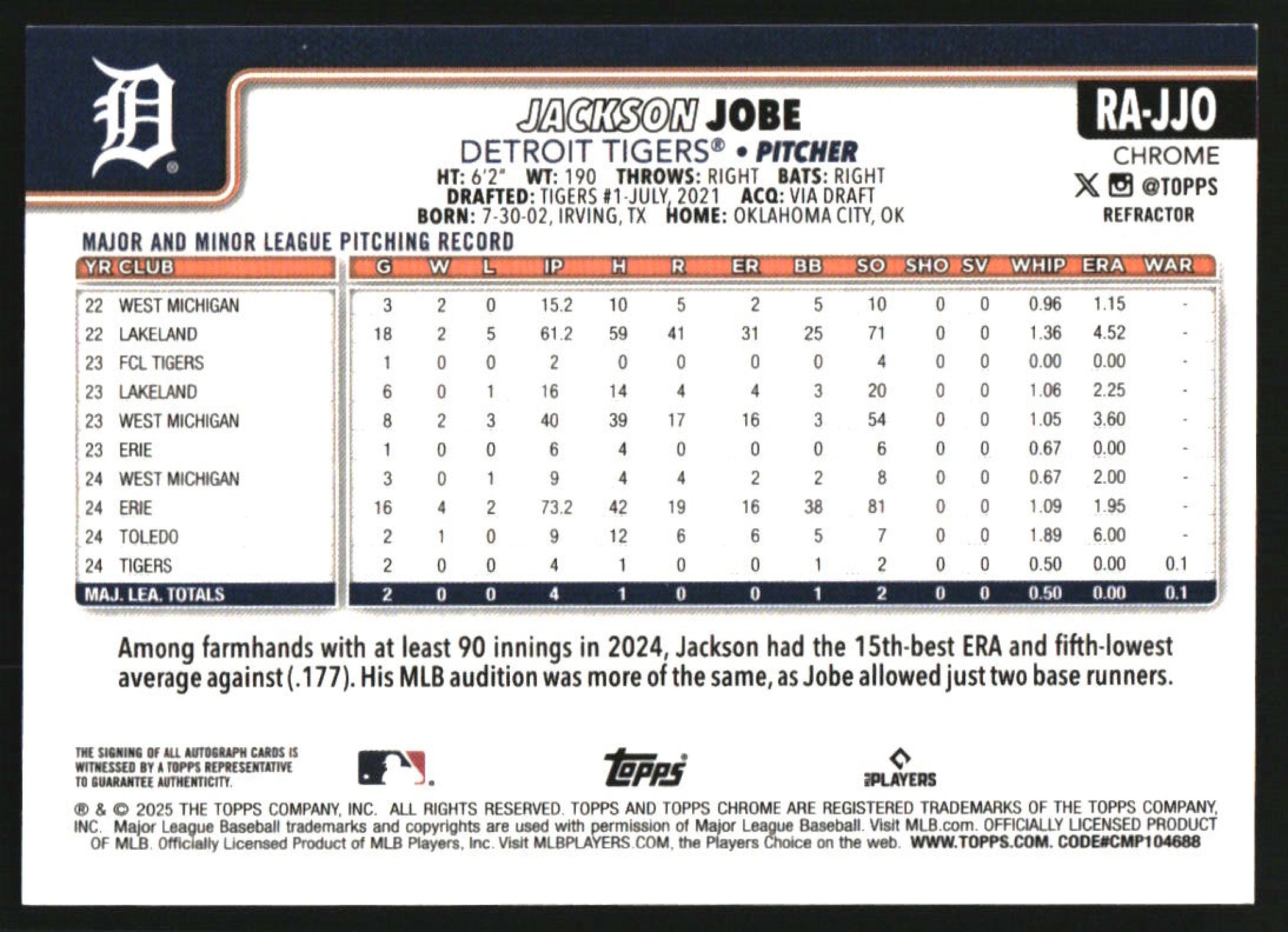 2025 Topps Chrome Rookie Autographs Refractor #RA-JJO Jackson Jobe RC Auto /499