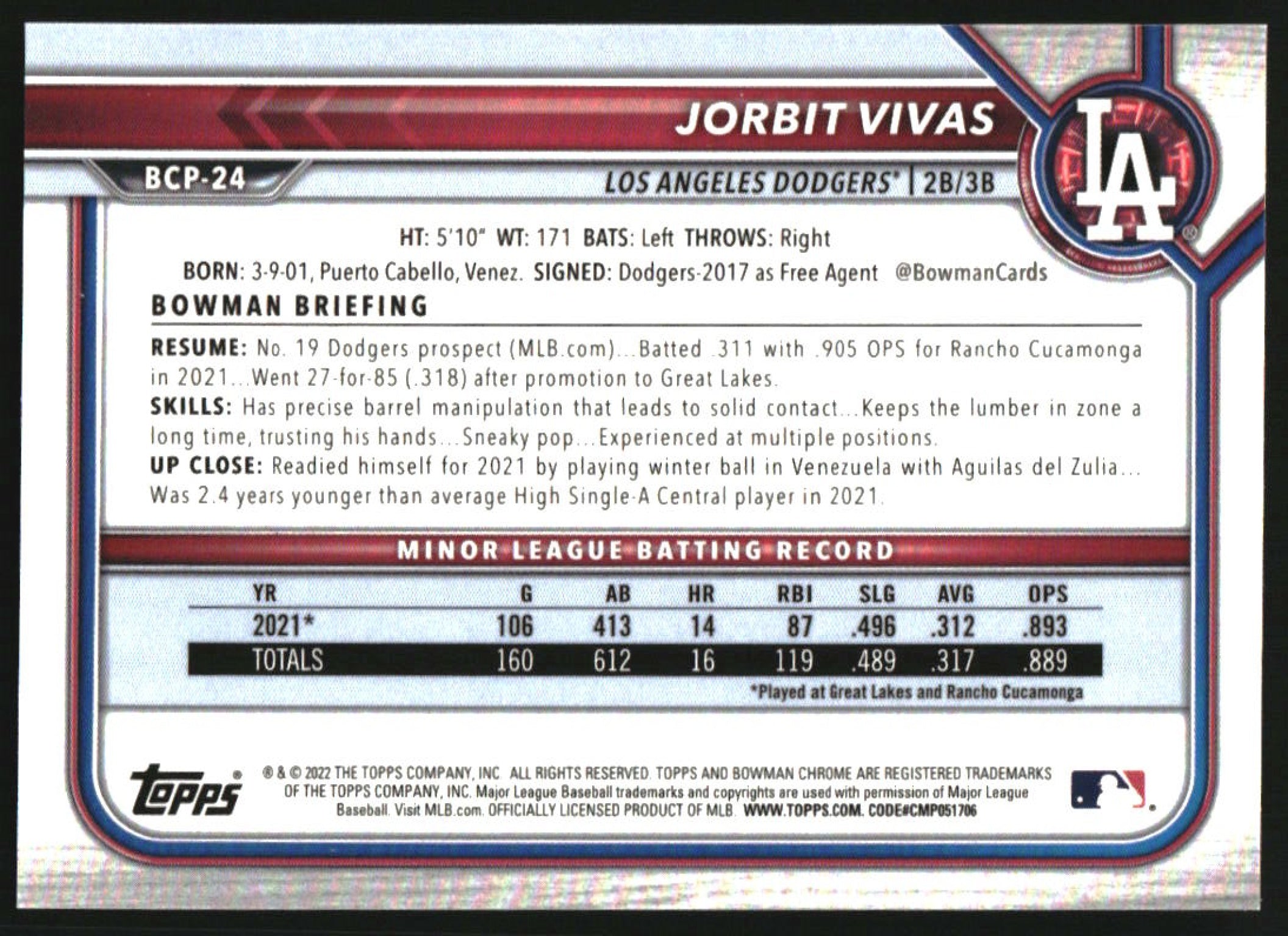 2022 Bowman Chrome Prospects Orange Shimmer Refractor #BCP-24 Jorbit Vivas /25