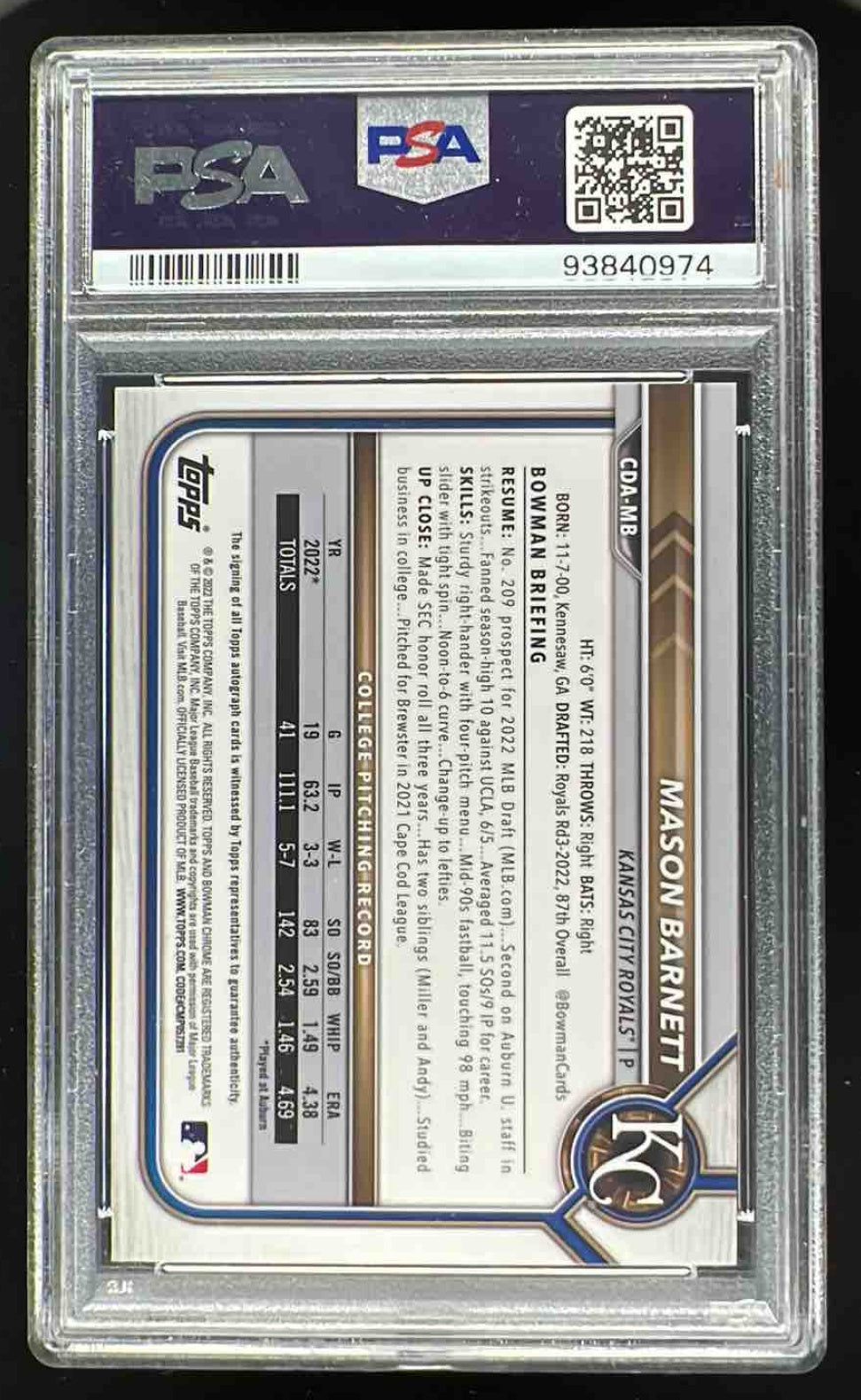2022 Bowman Draft Chrome Blue Refractor #CDA-MB Mason Barnett RC Auto /150 PSA 9
