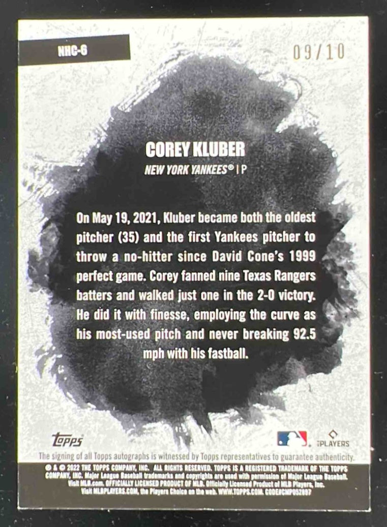 2022 Topps No-Hit Club Autographs #NHC-6 Corey Kluber Autograph Auto /10