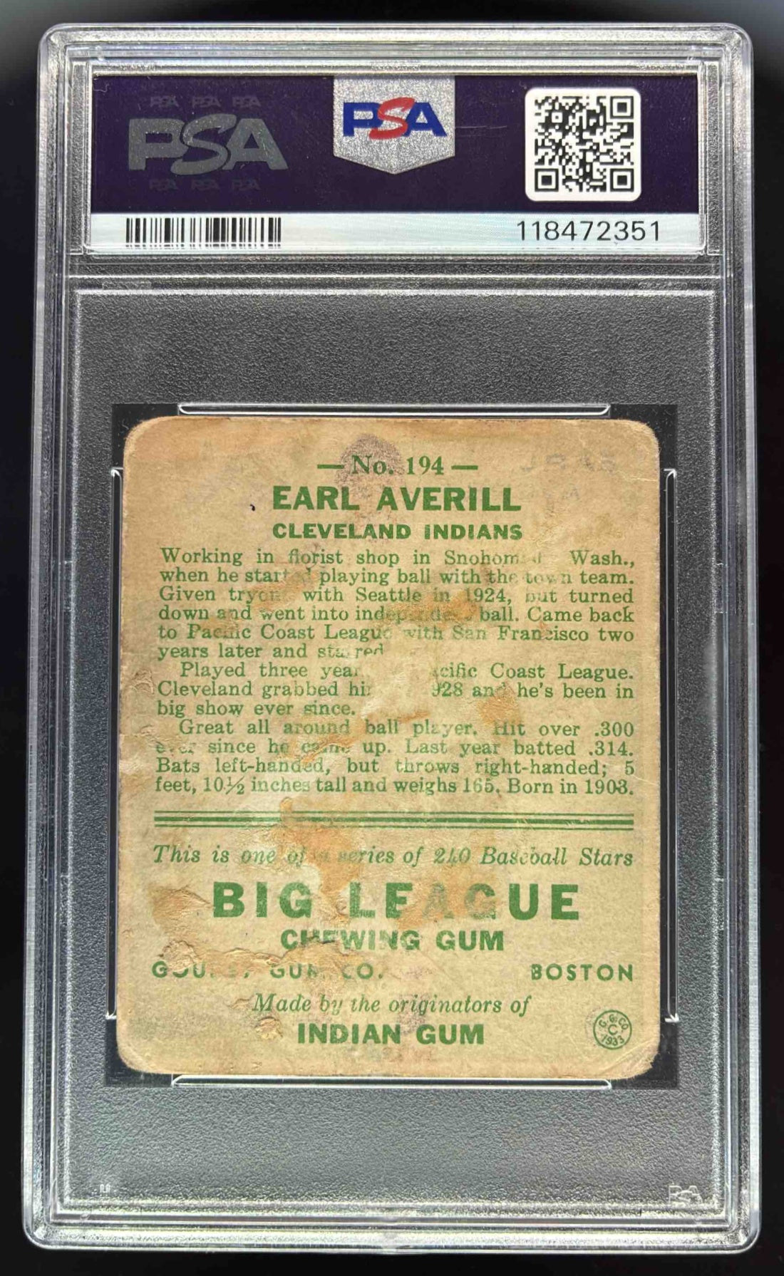 1933 Goudey (R319) #194 Earl Averill RC Autograph Auto PSA 1