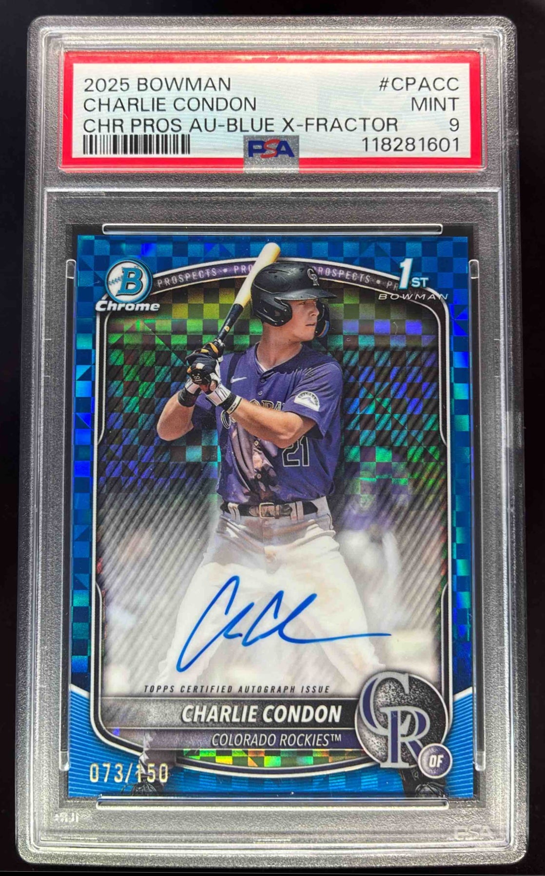 2025 Bowman Chrome Blue X-Fractor #CPA-CC Charlie Condon RC Auto /150 PSA 9