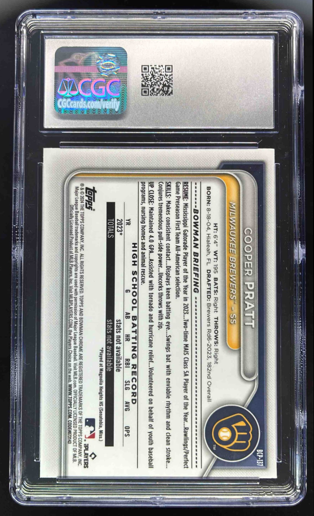 2024 Bowman Sapphire Chrome Yellow Sapphire #BCP-137 Cooper Pratt RC /75 CGC 10