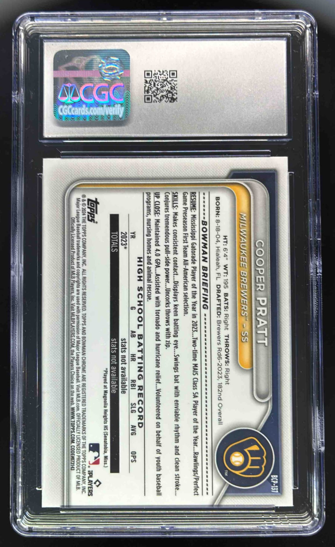 2024 Bowman Sapphire Chrome Yellow Sapphire #BCP-137 Cooper Pratt RC /75 CGC 10
