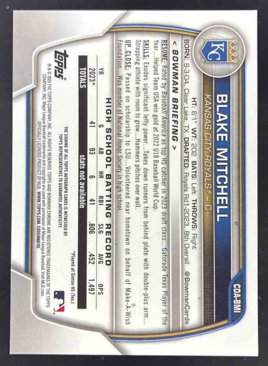 2023 Bowman Draft Chrome Autographs #CDA-BMI Blake Mitchell RC Auto