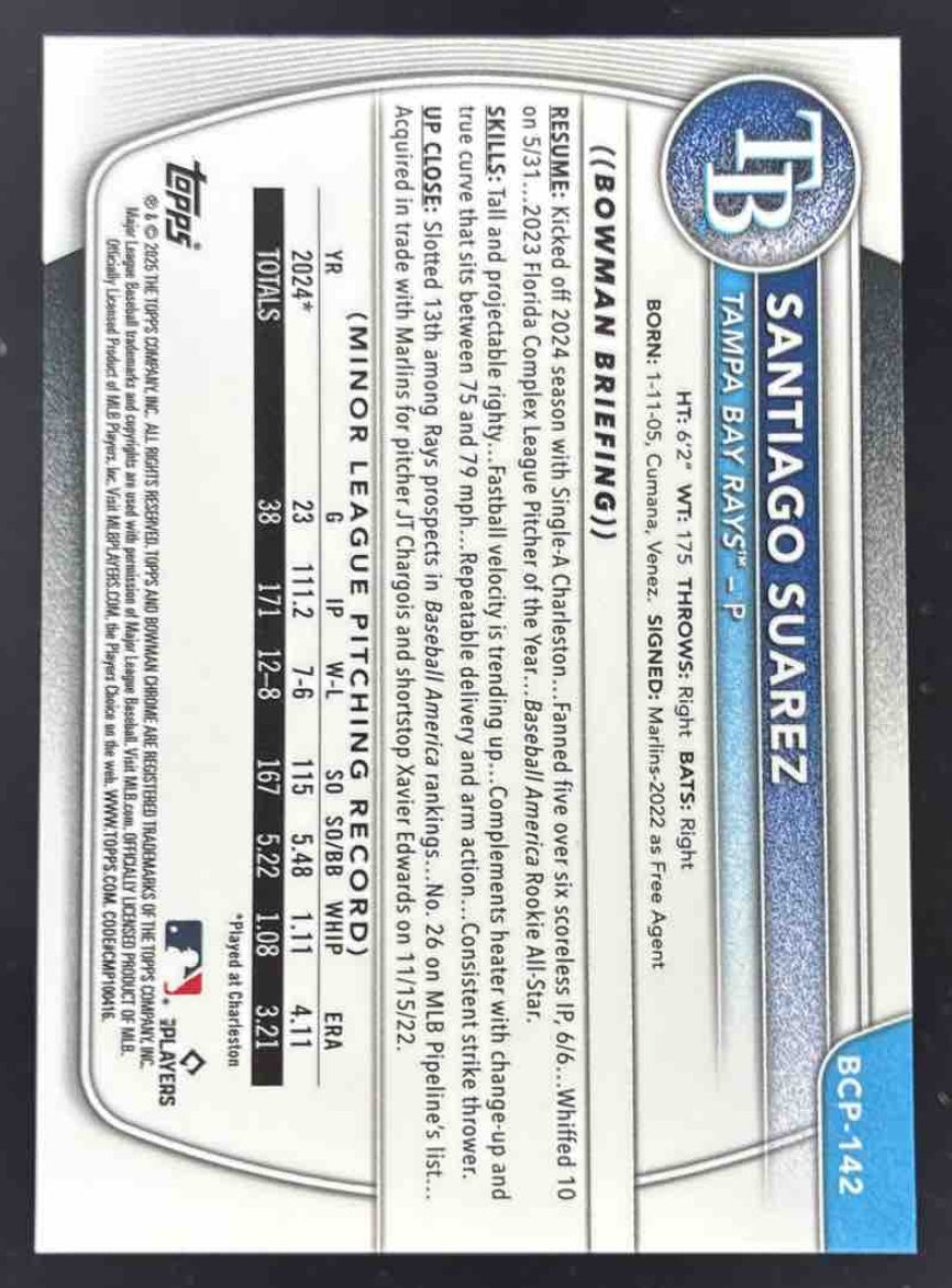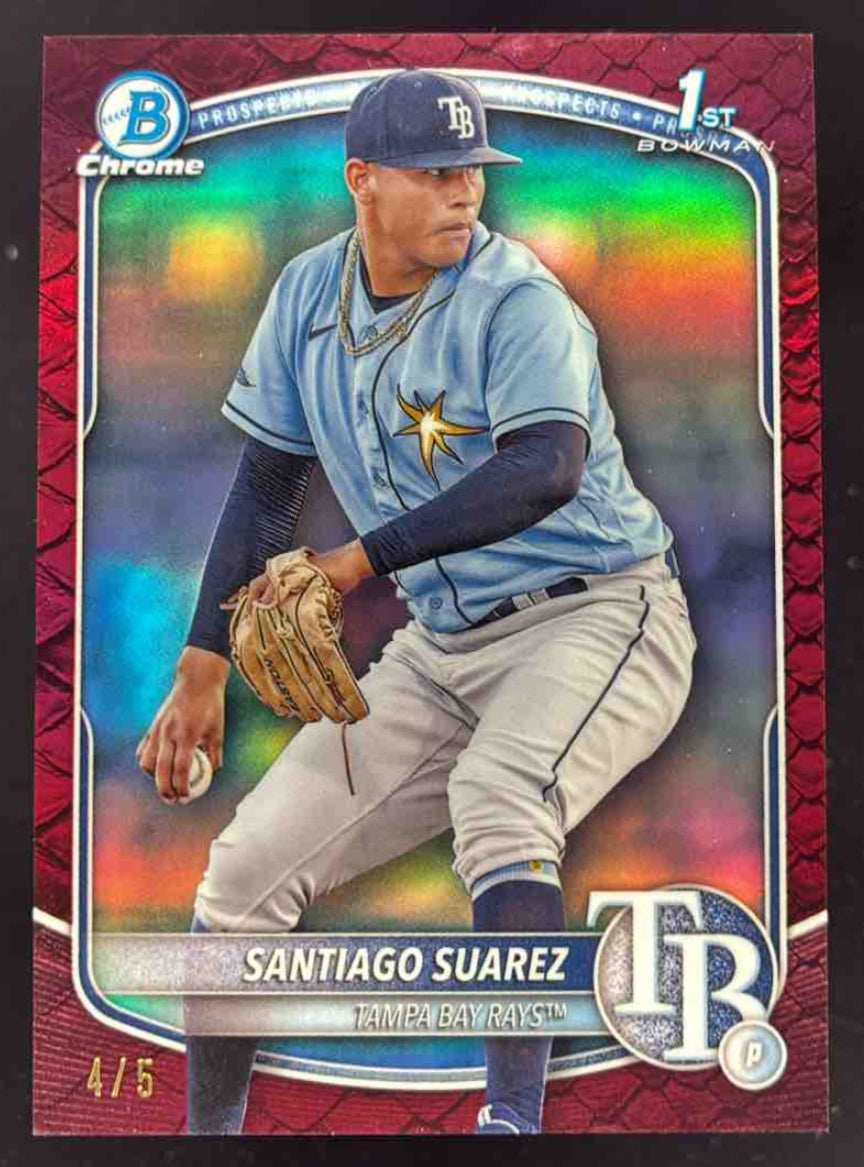 2025 Bowman Chrome Prospects Reptilian Red Refractor #142 Santiago Suarez RC /5