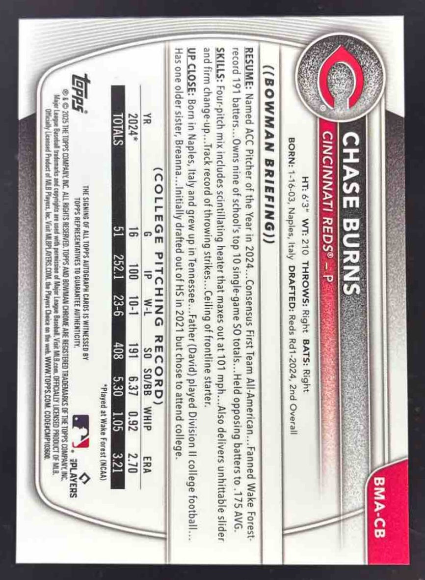 2025 Bowman Chrome Prospect Mega Box Orange Refractors #CB Chase Burns Auto /25
