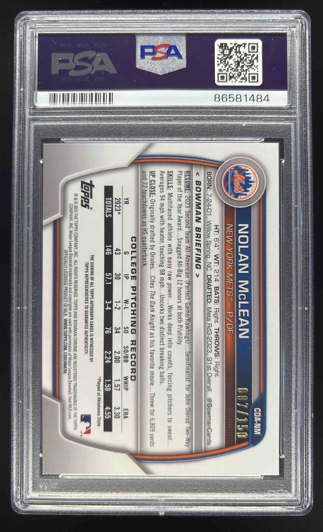 2023 Bowman Draft Chrome Blue Refractor #CDA-NM Nolan McLean RC Auto /150 PSA 10