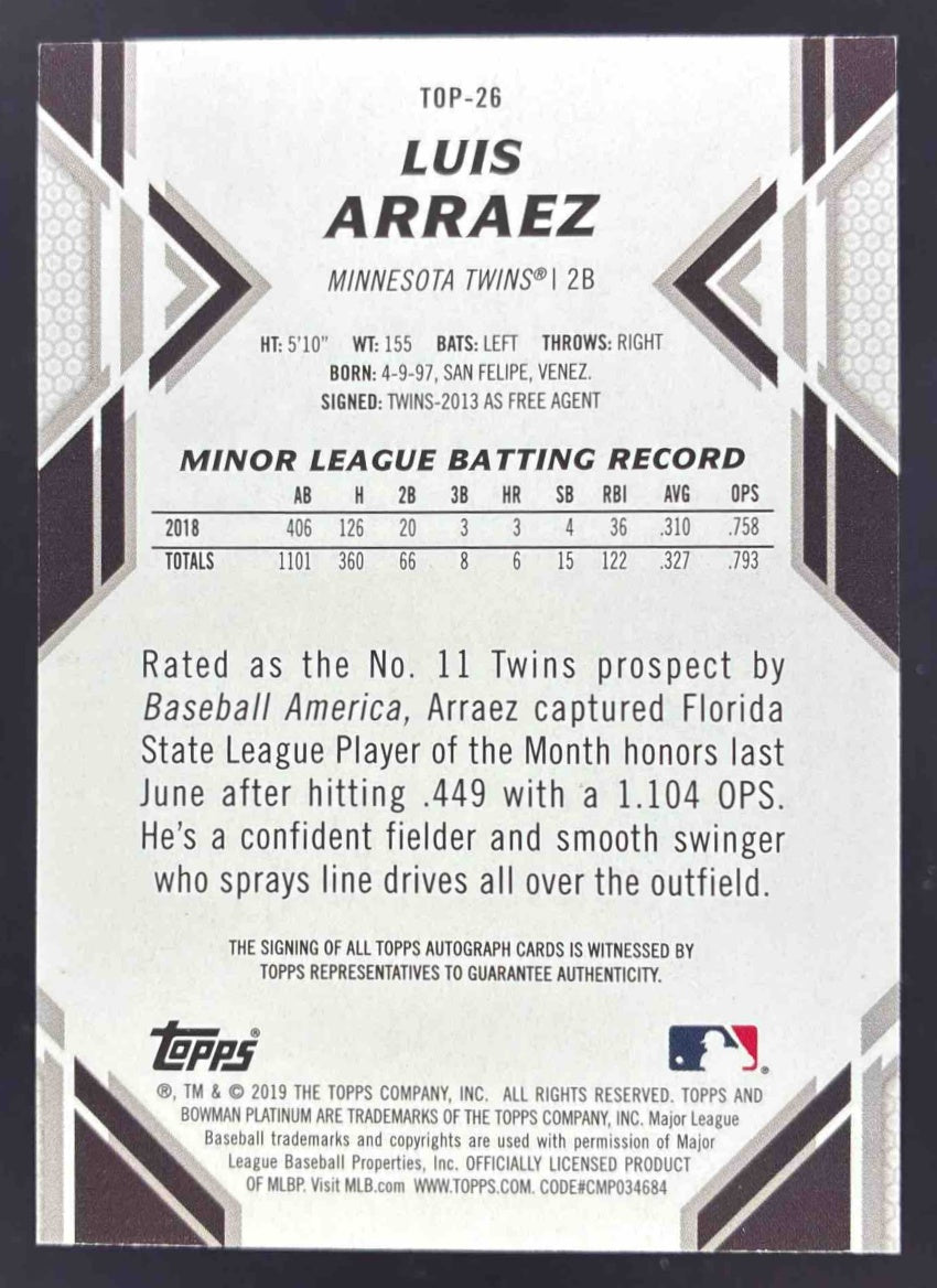 2019 Bowman Platinum Top Prospects Autographs Green #26 Luis Arraez RC Auto /99