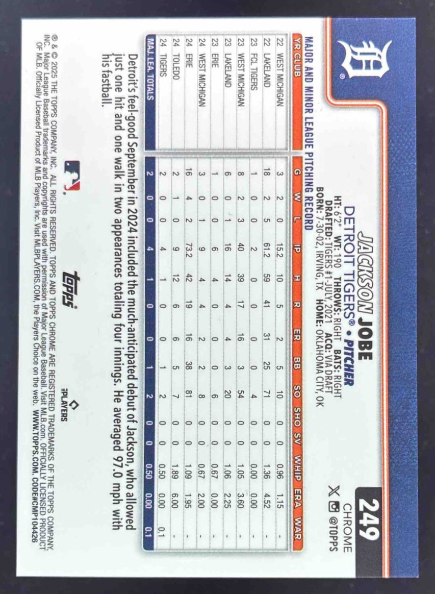 2025 Topps Chrome Sapphire Orange Refractor #249 Jackson Jobe RC /25