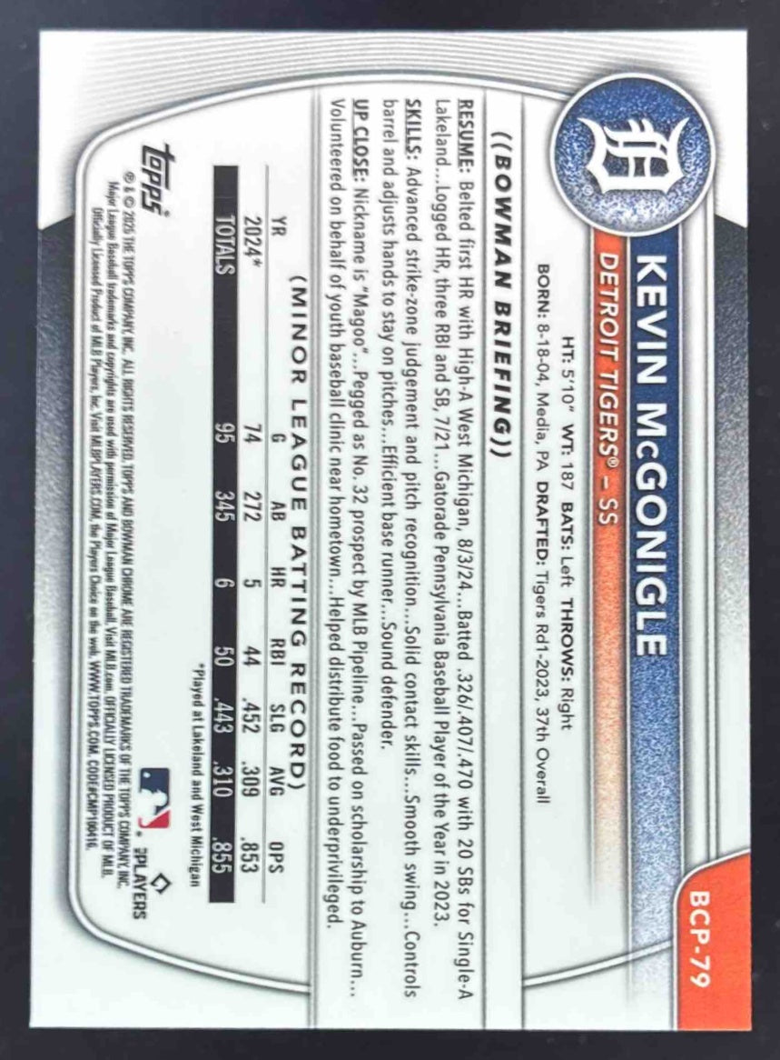 2025 Bowman Sapphire Chrome Yellow Refractors #BCP-79 Kevin McGonigle RC /75
