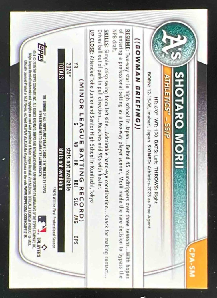 2025 Bowman Chrome Autograph Speckle Refractor #CPA-SM Shotaro Morii Auto /299