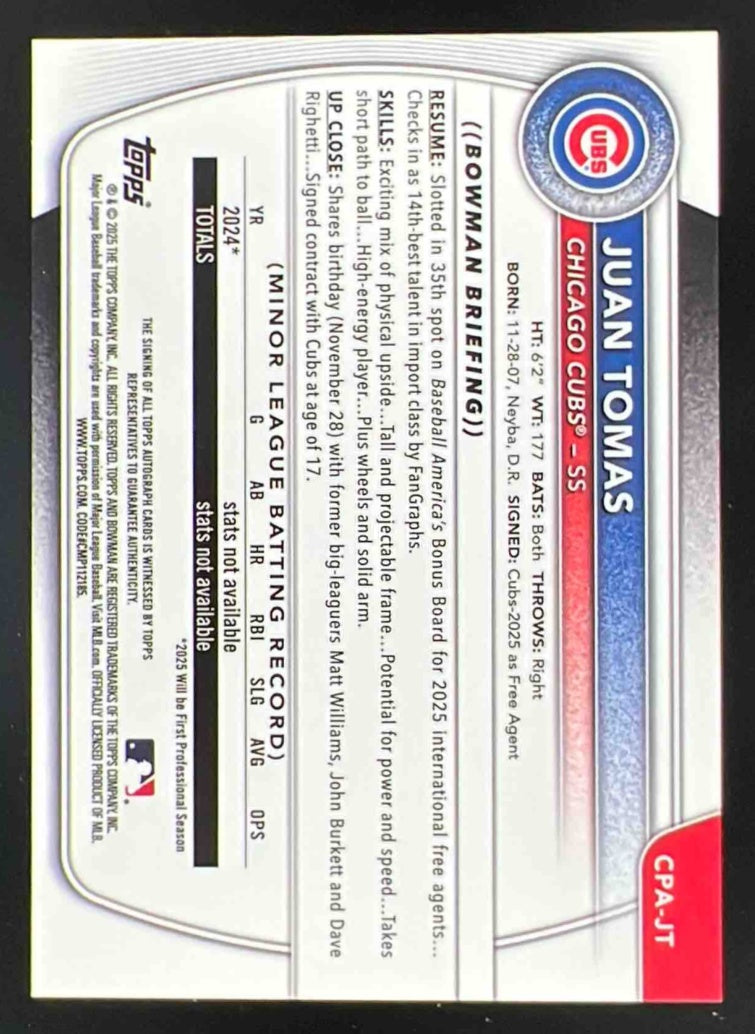 2025 Bowman Chrome Autograph Purple Refractor #CPA-JT Juan Tomas RC Auto /250