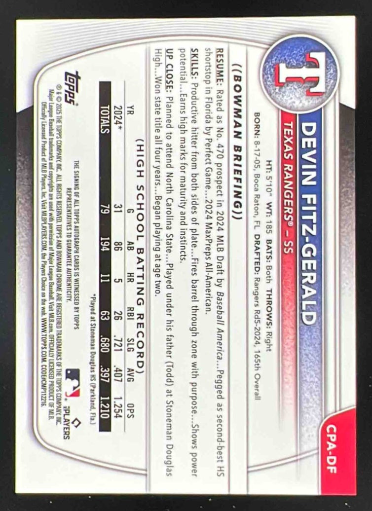 2025 Bowman Chrome Blue RayWave Refractor #CPA-DF Devin Fitz-Gerald RC Auto /150