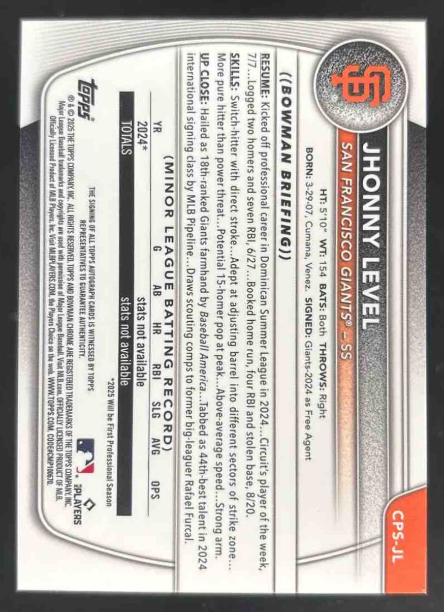 2025 Bowman Sapphire Chrome Autographs #CPS-JL Jhonny Level RC Auto /199
