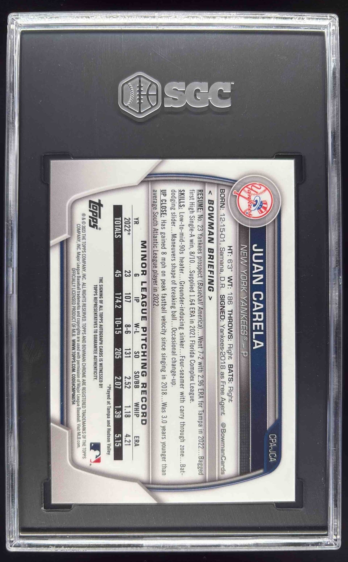 2023 Bowman Chrome Purple Refractor Juan Carela RC Auto /250 SGC 10