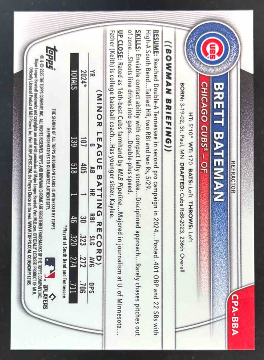 2025 Bowman Chrome Autograph Refractor #CPA-BBA Brett Bateman RC Auto /499