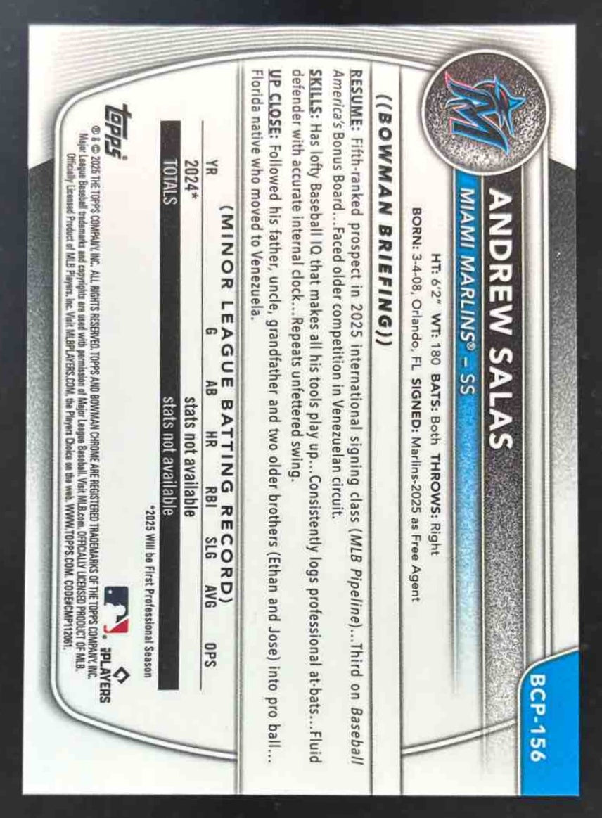 2025 Bowman Chrome Prospects Aqua Pulsar Refractor #BCP-156 Andrew Salas RC /125