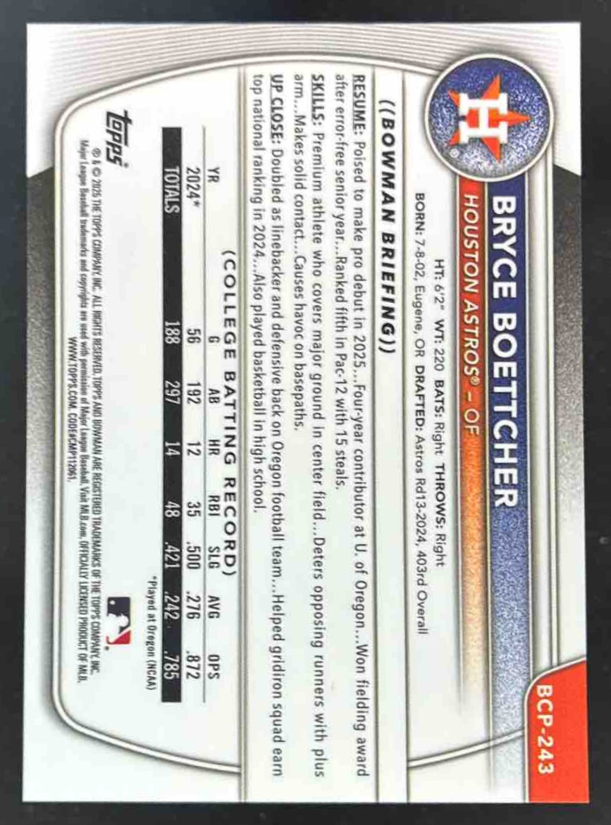 2025 Bowman Chrome Prospects Gold Wave Refractor #BCP-243 Bryce Boettcher RC /50