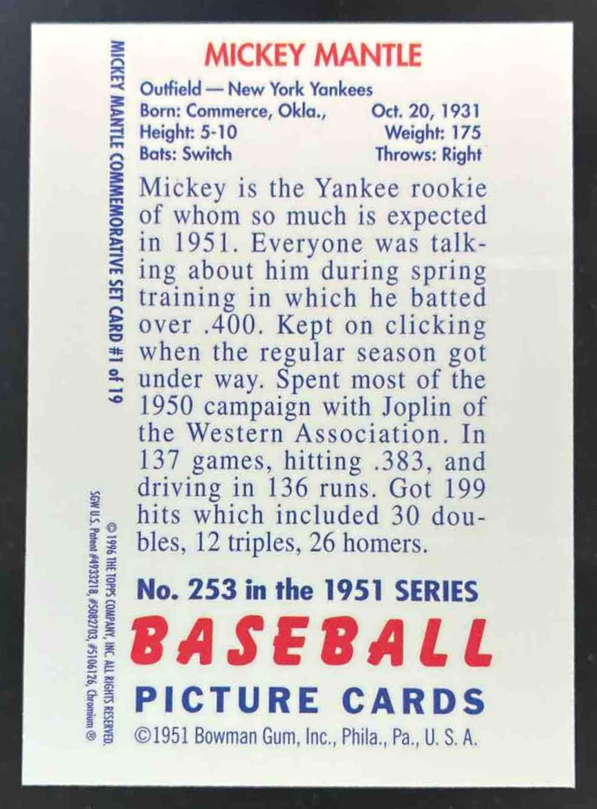 1996 Topps Mickey Mantle Commemorative Reprints Finest Refractor Mickey Mantle