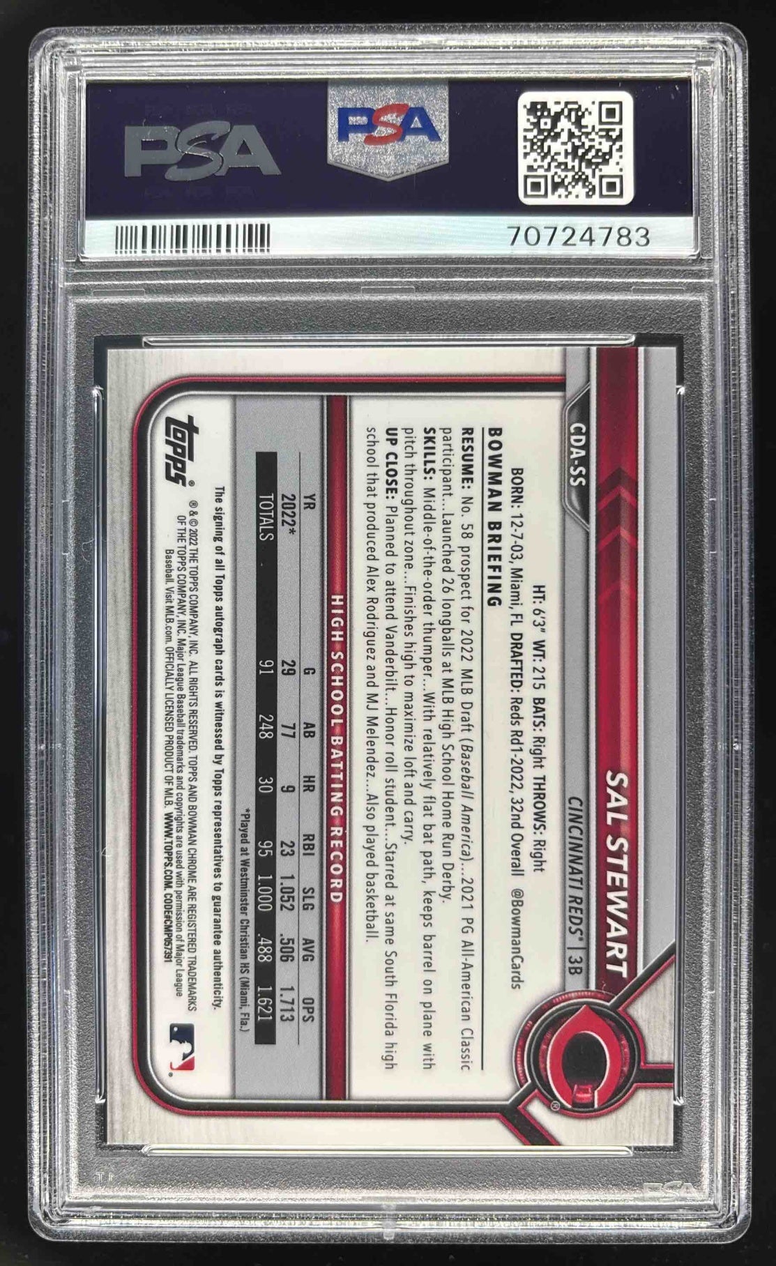 2022 Bowman Draft Chrome Pick Autographs #CDA-SS Sal Stewart RC Auto PSA 9