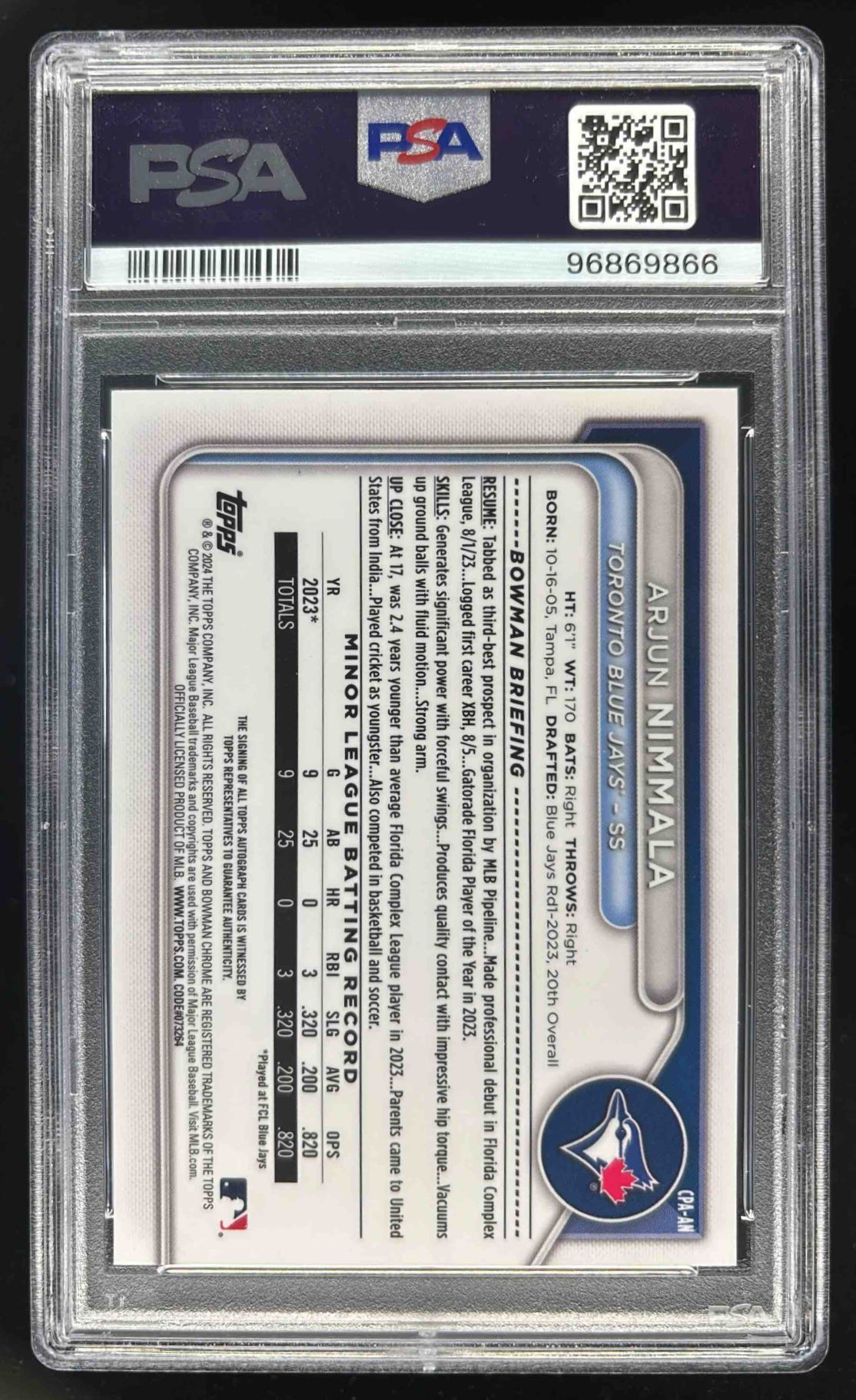 2024 Bowman Chrome Autographs #CPA-AN Arjun Nimmala RC Auto PSA 10
