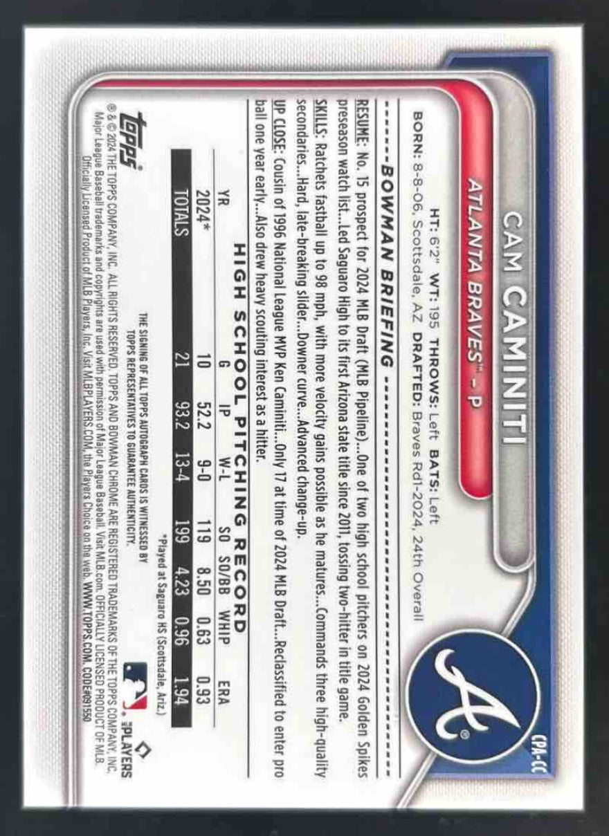 2024 Bowman Draft Chrome Purple Refractor #CPA-CC Cam Caminiti RC Auto /250