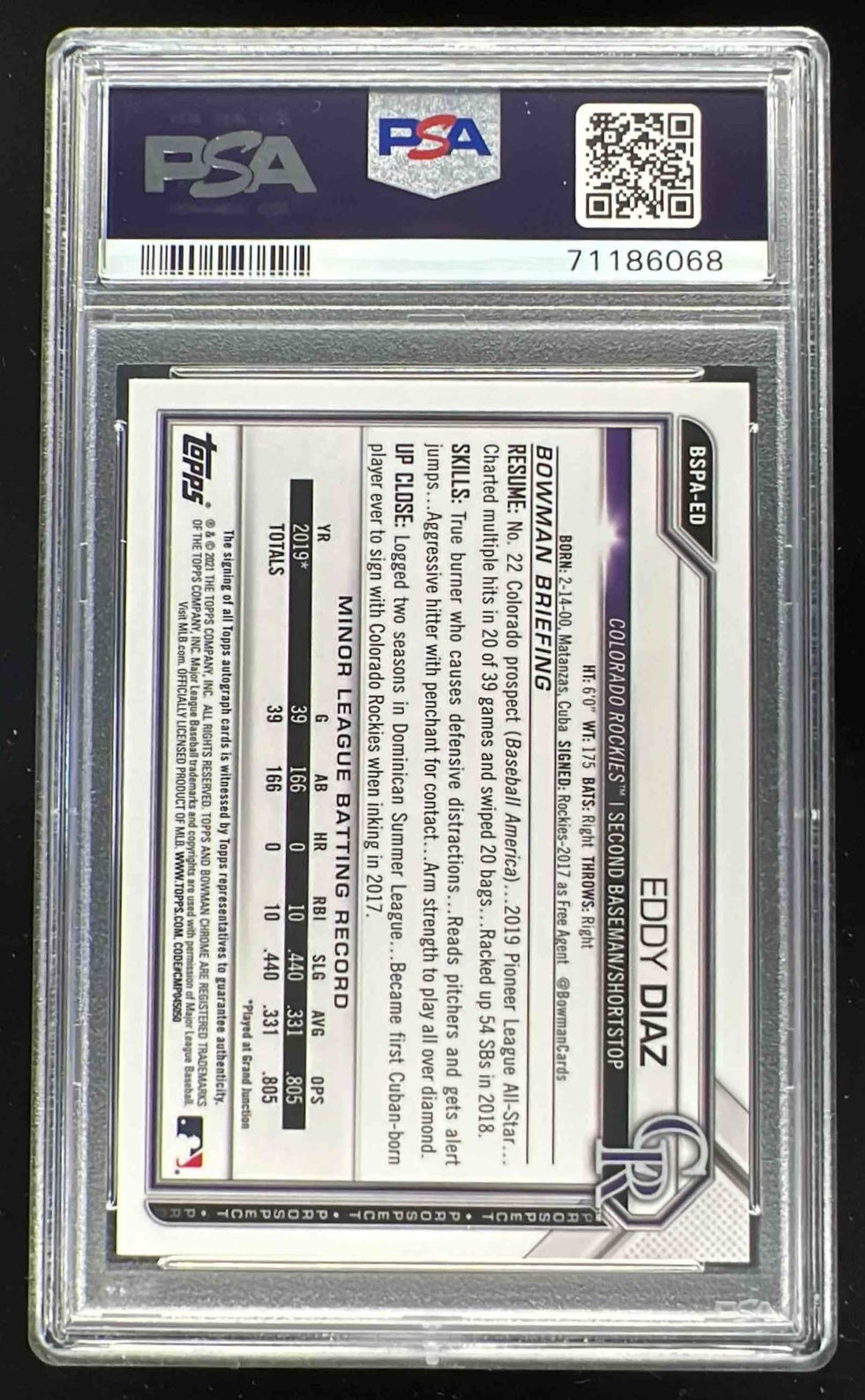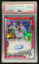 2021 Bowman Sapphire Chrome Autographs Red #BSPA-ED Eddy Diaz Auto /5 PSA 10