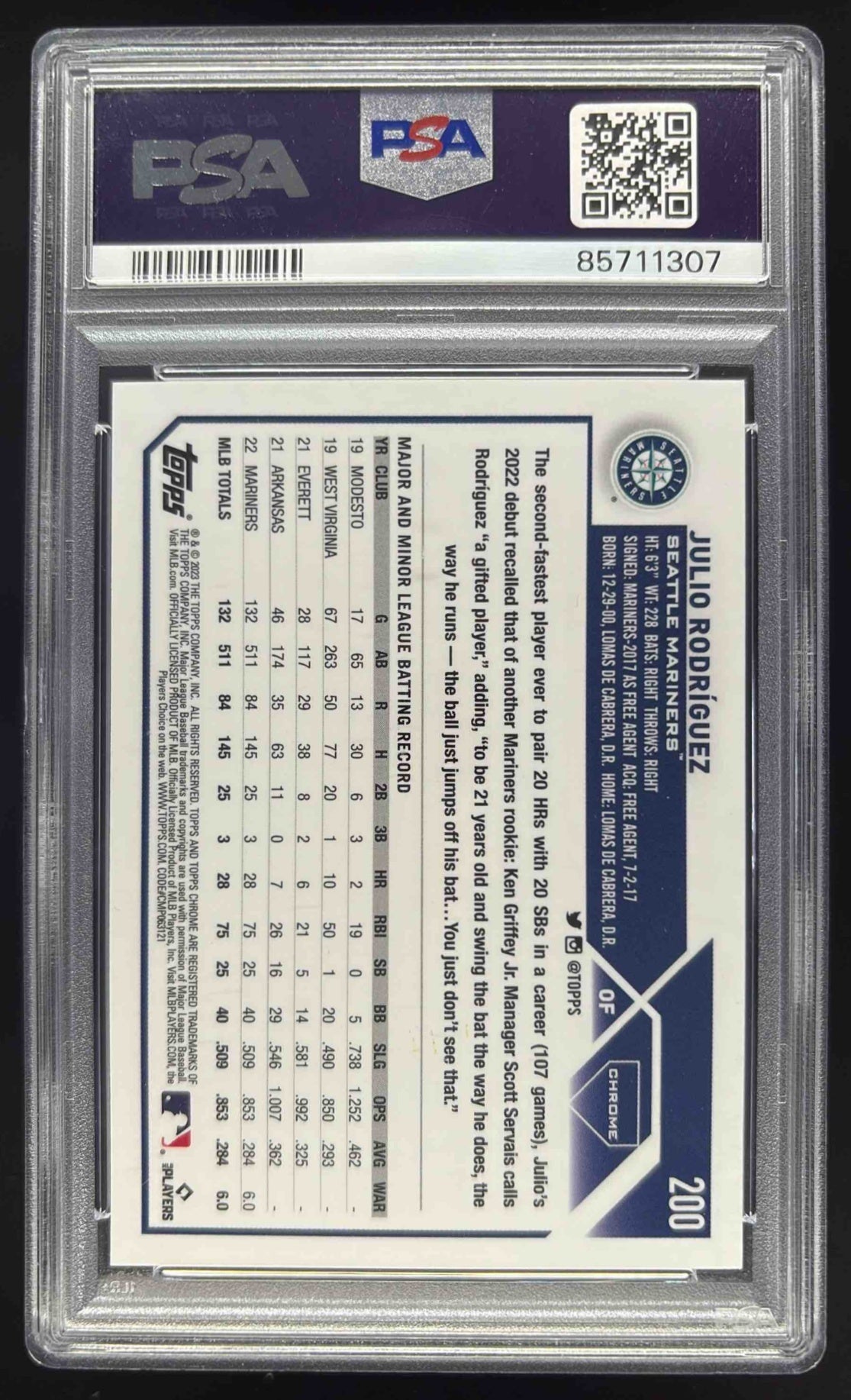 2023 Topps Chrome Purple Speckle Refractor #200 Julio Rodriguez /299 PSA 9