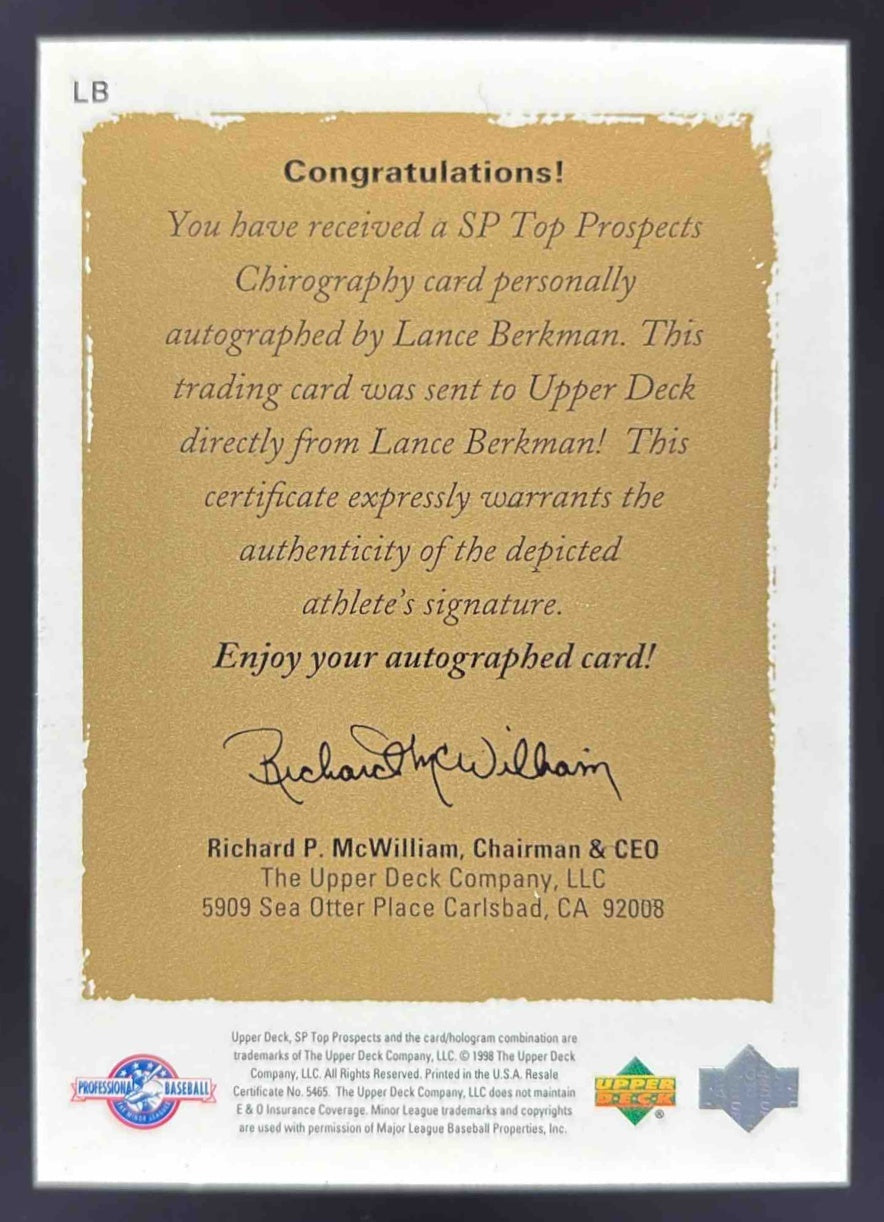 1999 SP Top Prospects Chirography #LB Lance Berkman Autograph Auto