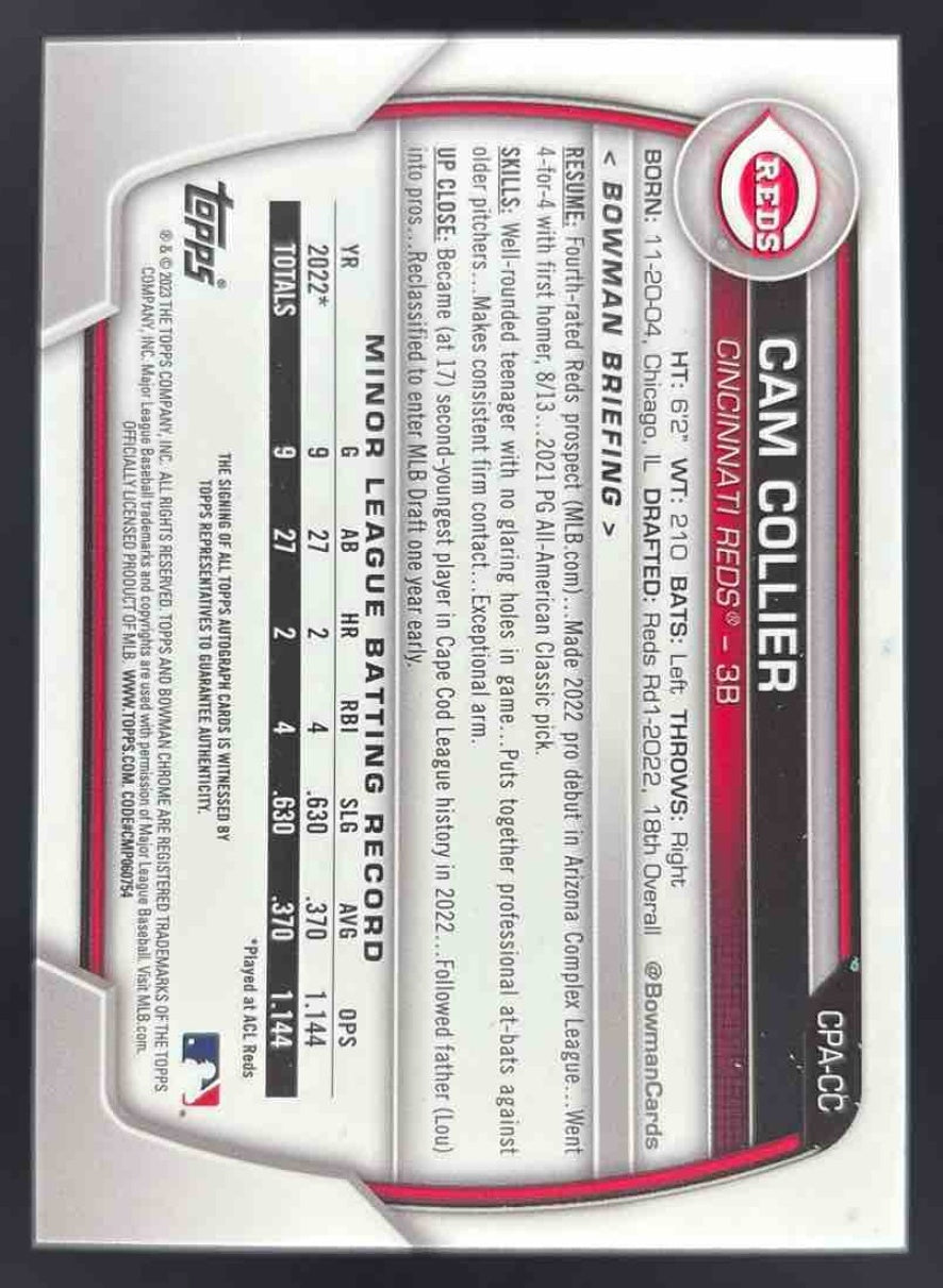 2023 Bowman Chrome Autographs #CPA-CC Cam Collier Autograph RC Auto