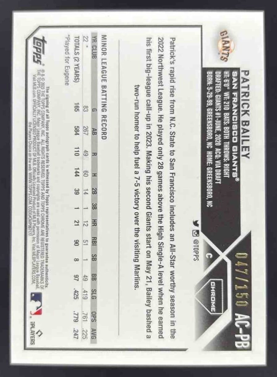 2023 Topps Chrome Autographs Blue Refractor #AC-PB Patrick Bailey RC Auto /150