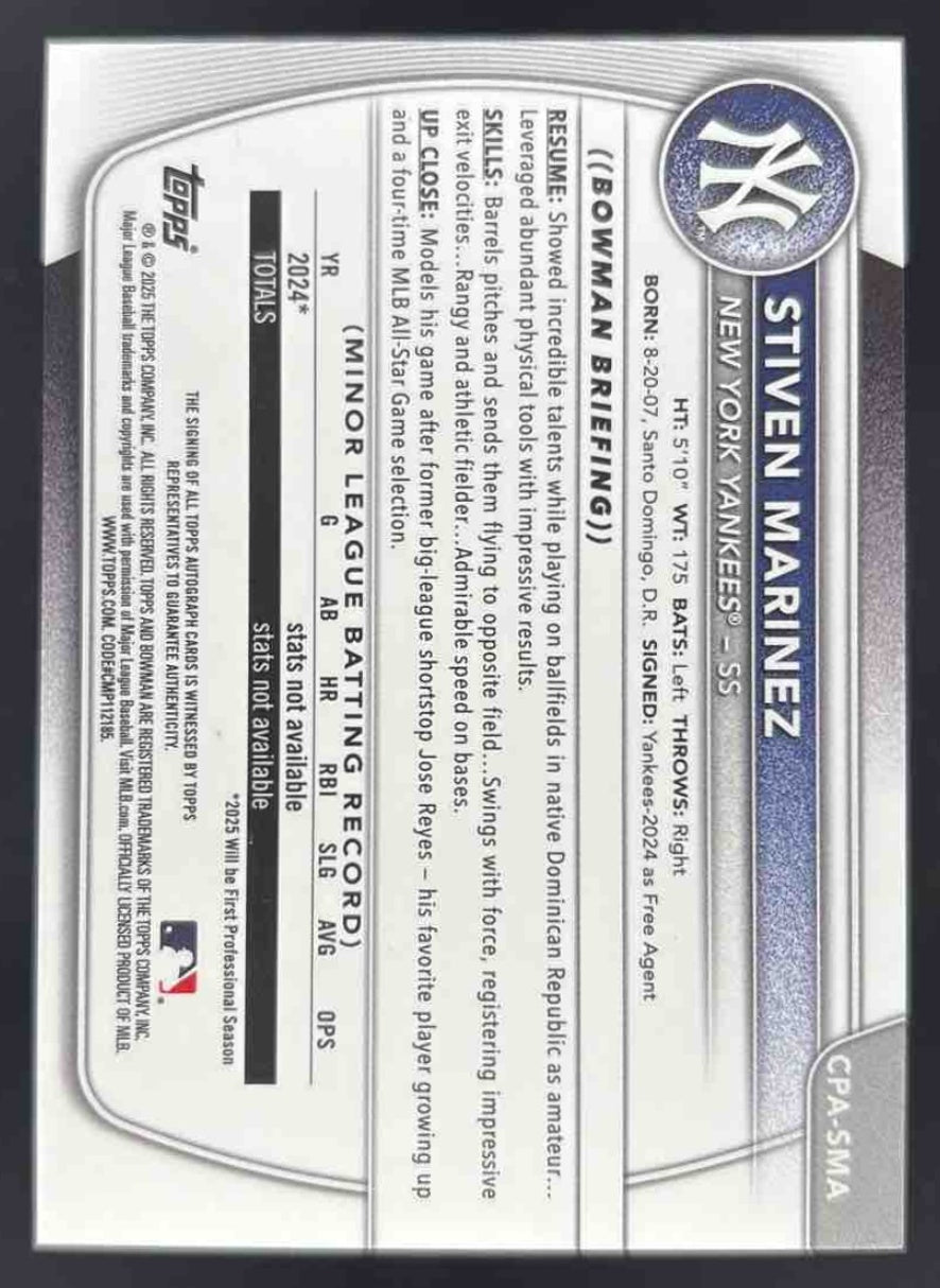 2025 Bowman Chrome Autograph Purple Refractor #SMA Stiven Marinez RC Auto /250