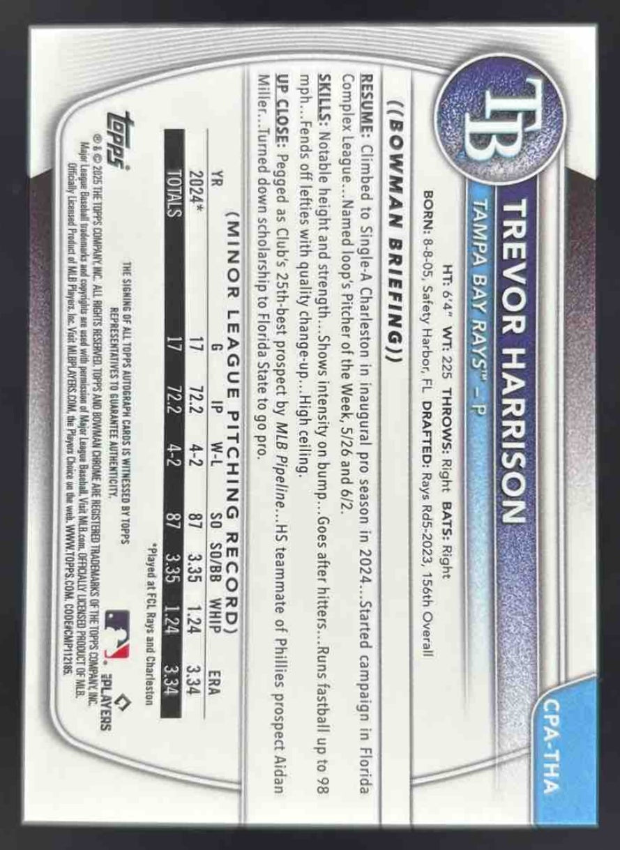 2025 Bowman Chrome HTA Choice Refractor #CPA-THA Trevor Harrison RC Auto /150