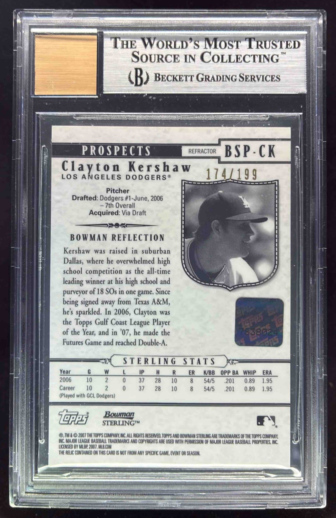 2007 Bowman Sterling Prospects Refractor #BSP-CK Clayton Kershaw Auto /199 BGS 9