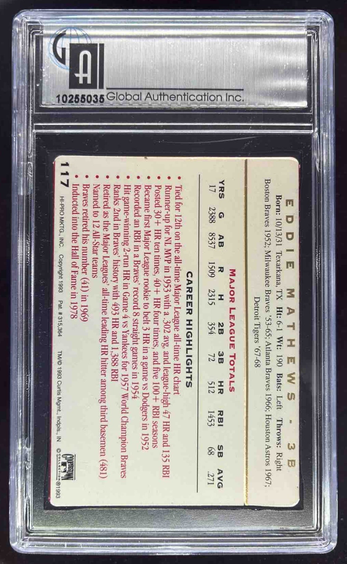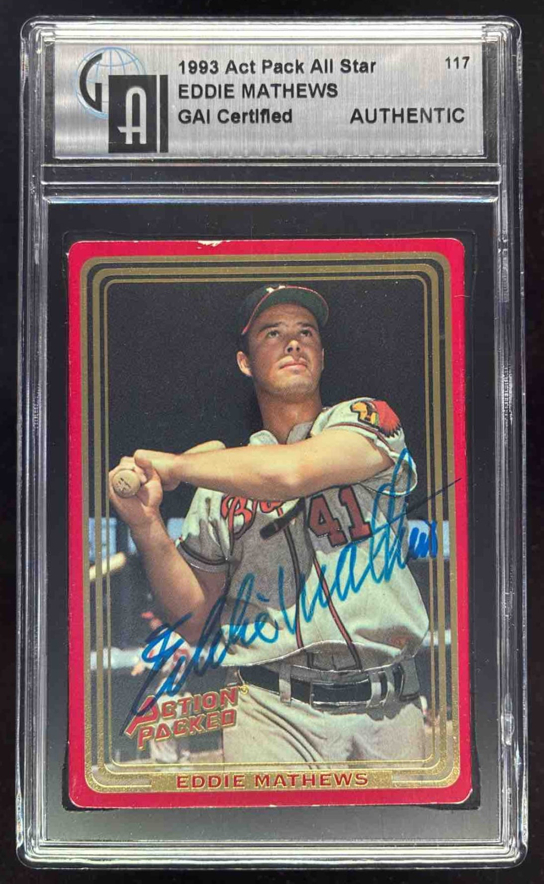 1993 Action Packed All Star #117 Eddie Mathews Autograph Auto GAI Authentic